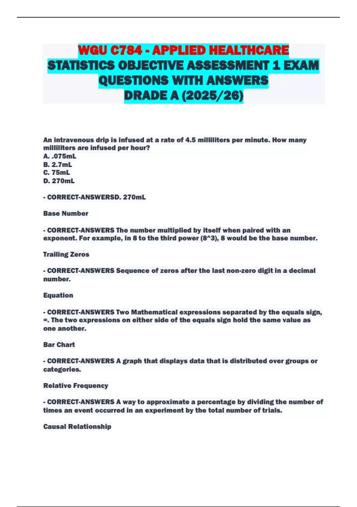 This document includes the full set of exam-style questions and accurate answers for the WGU C784 course on Applied Healthcare Statistics, specifically for Objective Assessment 1 in the 2025/26 academic year. It covers core topics such as data analysis, graph interpretation, probability, statistical calculations, regression, and healthcare-specific quantitative reasoning. The guide is ideal for mastering key exam concepts and ensuring readiness through clearly structured Q&A format.