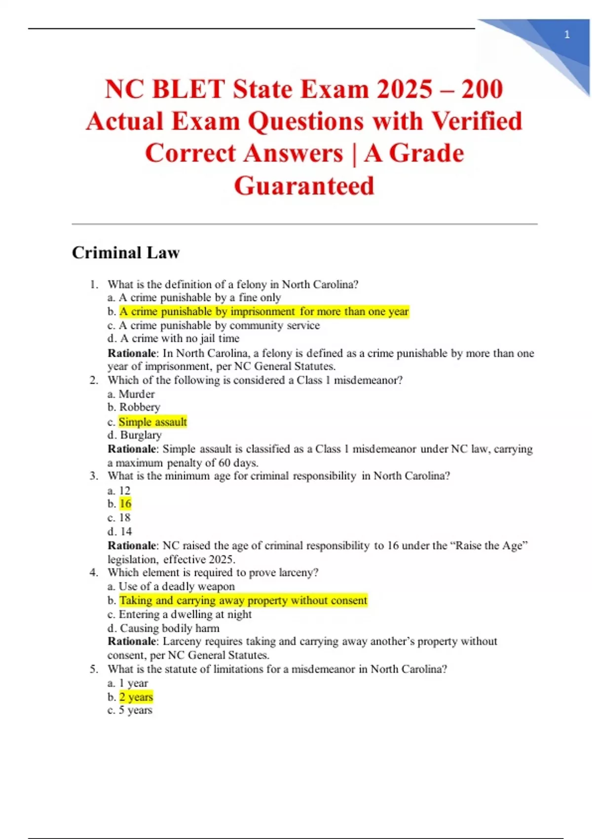 NC BLET State Exam 2025 – 200 Actual Exam Questions with Verified Correct Answers | A Grade Guaranteed