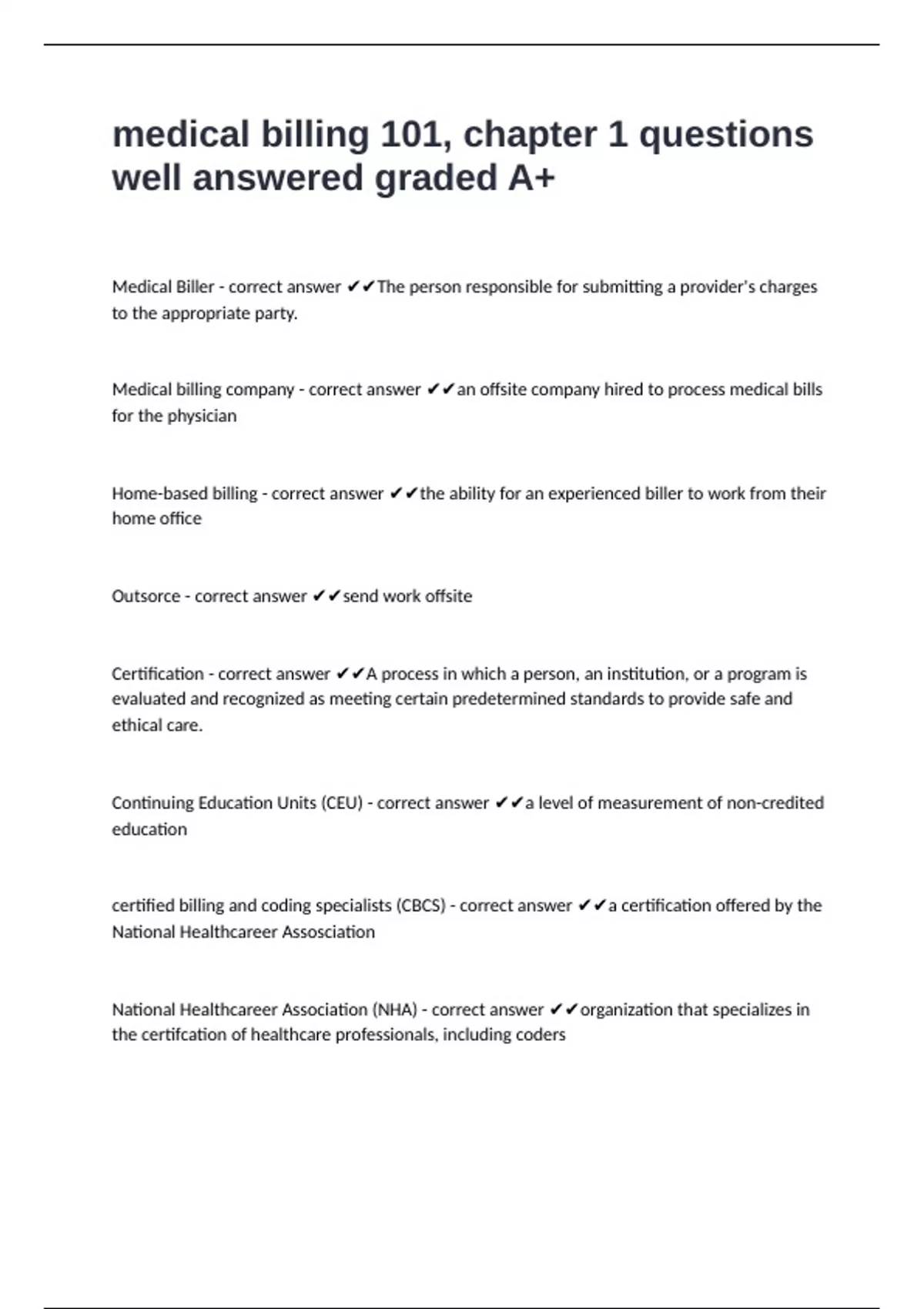 medical billing 101, chapter 1 questions well answered graded A+
