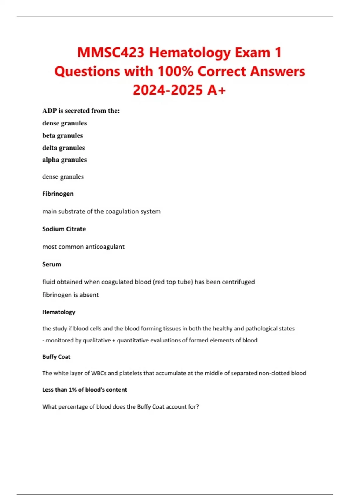 MMSC423 Hematology Exam 1 Questions with 100% Correct Answers A+