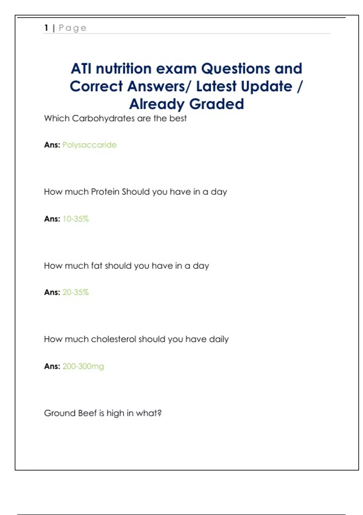 This document provides a fully updated and graded collection of ATI Nutrition Exam questions and correct answers tailored for nursing students in the United States. It covers essential nutrition topics such as macronutrients, vitamin and mineral functions, therapeutic diets (e.g., renal, diabetic, gastric bypass), feeding methods (e.g., tube feeding, gavage), infant and maternal nutrition, and dietary considerations for common diseases. Perfect for ATI test prep or NCLEX review, this guide contains over 100 Q&A formatted in a direct and easy-to-study style.