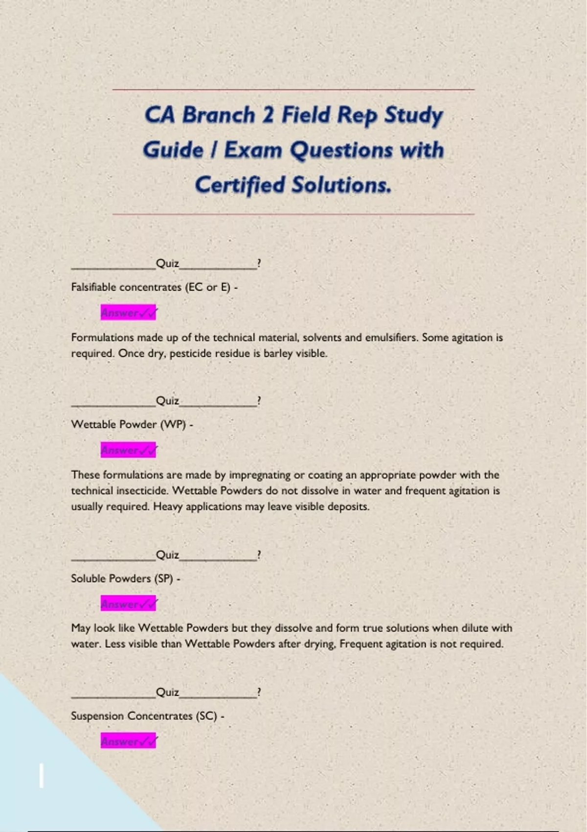 CA Branch 2 Field Rep Study Guide / Exam Questions with Certified Solutions. _____________Quiz____________? Falsifiable concentrates (EC or E) - Answer Formulations made up of the technical material, solvents and emulsifiers. Some agitation is required. Once dry, pesticide residue is barley visible. _____________Quiz____________? Wettable Powder (WP) - Answer These formulations are made by impregnating or coating an appropriate powder with the technical insecticide. Wettable Powders do not dissolve in water and frequent agitation is usually required. Heavy applications may leave visible deposits. _____________Quiz____________? Soluble Powders (SP) - Answer May look like Wettable Powders but they dissolve and form true solutions when dilute with water. Less visible than Wettable Powders after drying, Frequent agitation is not required. _____________Quiz____________? Suspension Concentrates (SC) - Answer