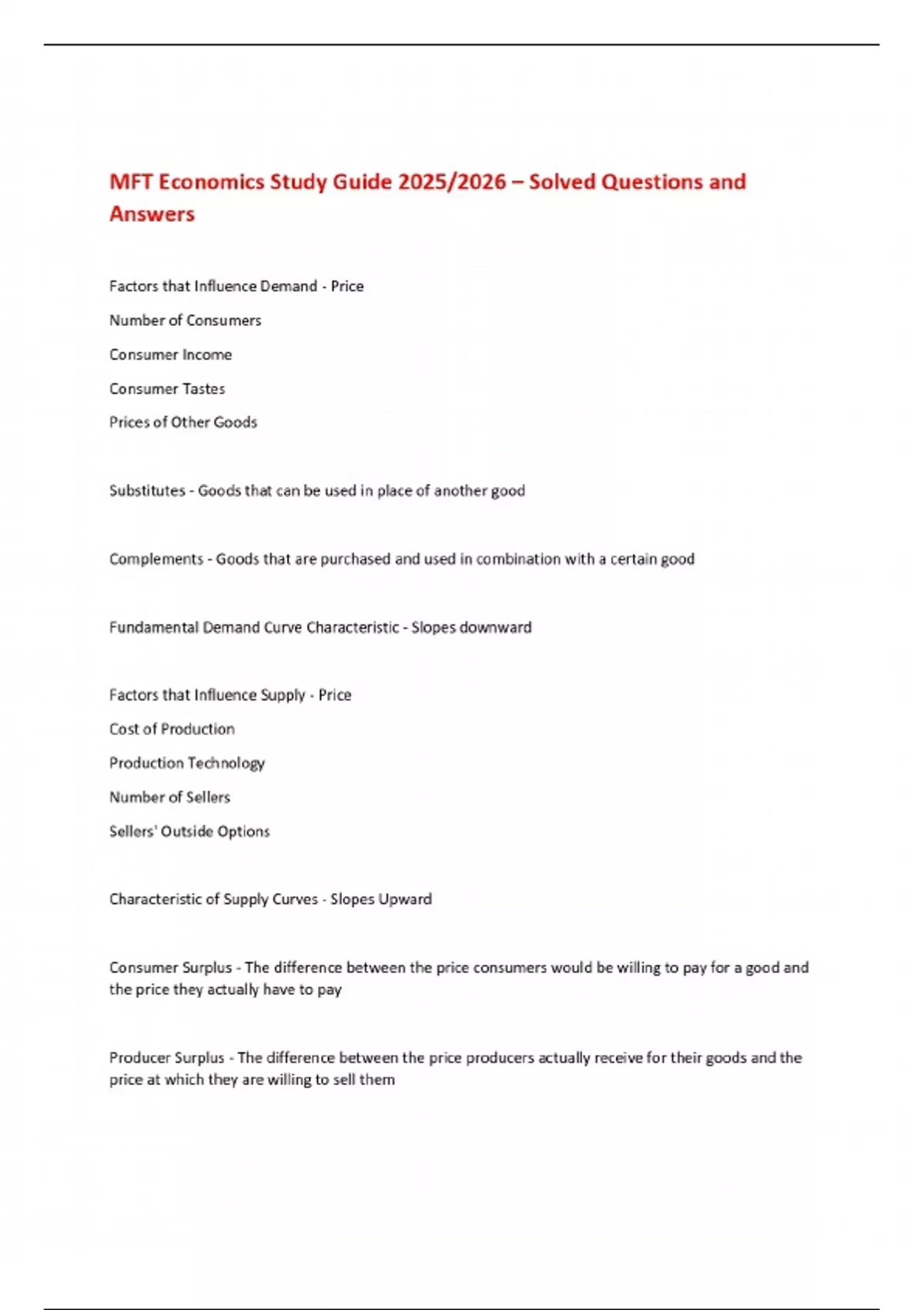 MFT Economics Study Guide 2025/2026 – Solved Questions and Answers