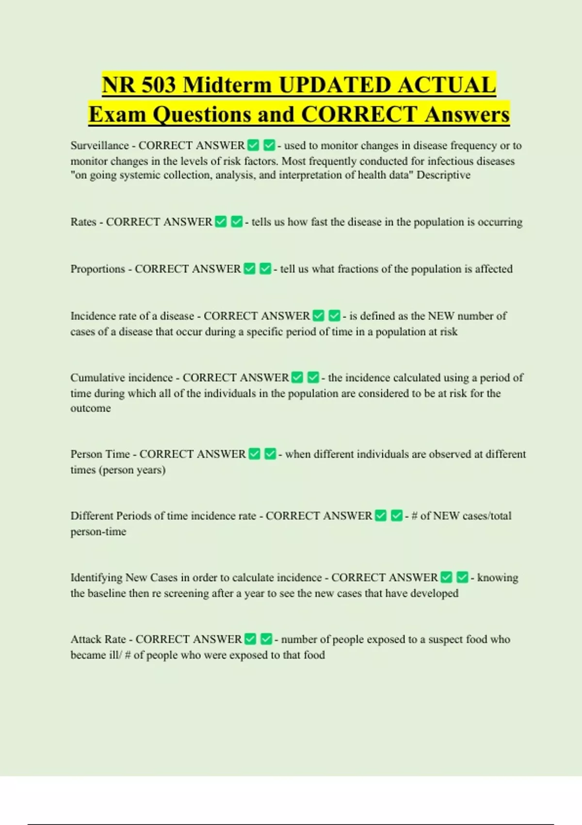 NR 503 Midterm UPDATED ACTUAL Exam Questions and CORRECT Answers Surveillance - CORRECT ANSWER - used to monitor changes in disease frequency or to monitor changes in the levels of risk factors. Most frequently conducted for infectious diseases "on going systemic collection, analysis, and interpretation of health data" Descriptive Rates - CORRECT ANSWER Proportions - CORRECT ANSWER - tells us how fast the disease in the population is occurring - tell us what fractions of the population is affected