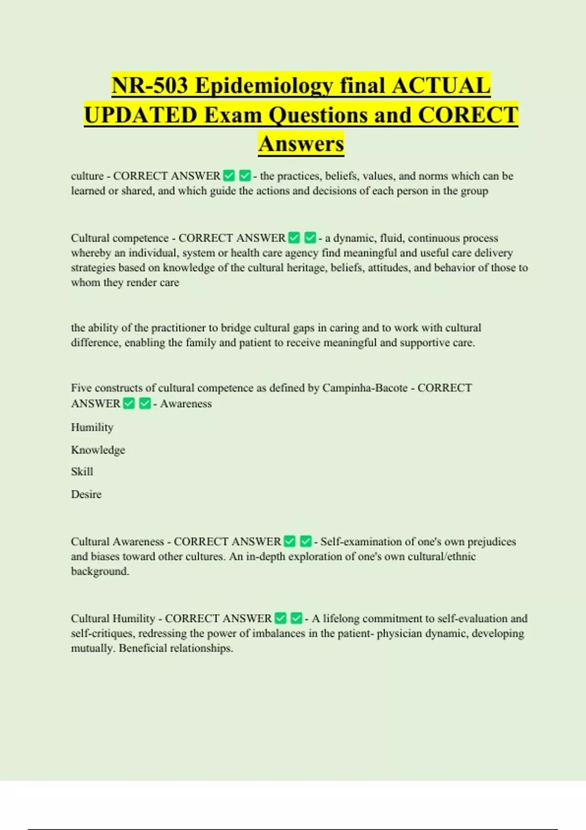 NR-503 Epidemiology final ACTUAL UPDATED Exam Questions and CORECT Answers culture - CORRECT ANSWER - the practices, beliefs, values, and norms which can be learned or shared, and which guide the actions and decisions of each person in the group Cultural competence - CORRECT ANSWER - a dynamic, fluid, continuous process whereby an individual, system or health care agency find meaningful and useful care delivery strategies based on knowledge of the cultural heritage, beliefs, attitudes, and behavior of those to whom they render care the ability of the practitioner to bridge cultural gaps in caring and to work with cultural difference, enabling the family and patient to receive meaningful and supportive care.
