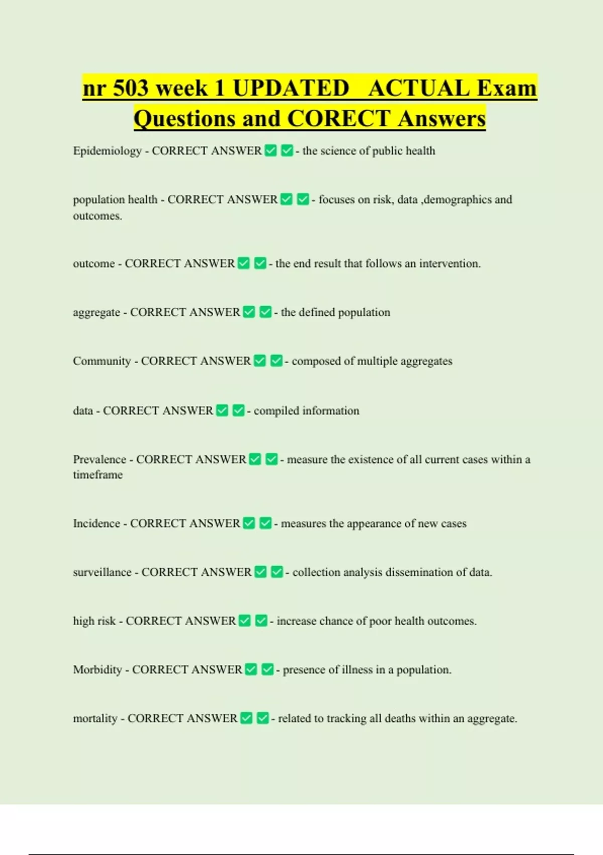 nr 503 week 1 UPDATED ACTUAL Exam Questions and CORECT Answers Epidemiology - CORRECT ANSWER population health - CORRECT ANSWER outcomes. outcome - CORRECT ANSWER - the science of public health - focuses on risk, data ,demographics and - the end result that follows an intervention. aggregate - CORRECT ANSWER Community - CORRECT ANSWER data - CORRECT ANSWER - the defined population