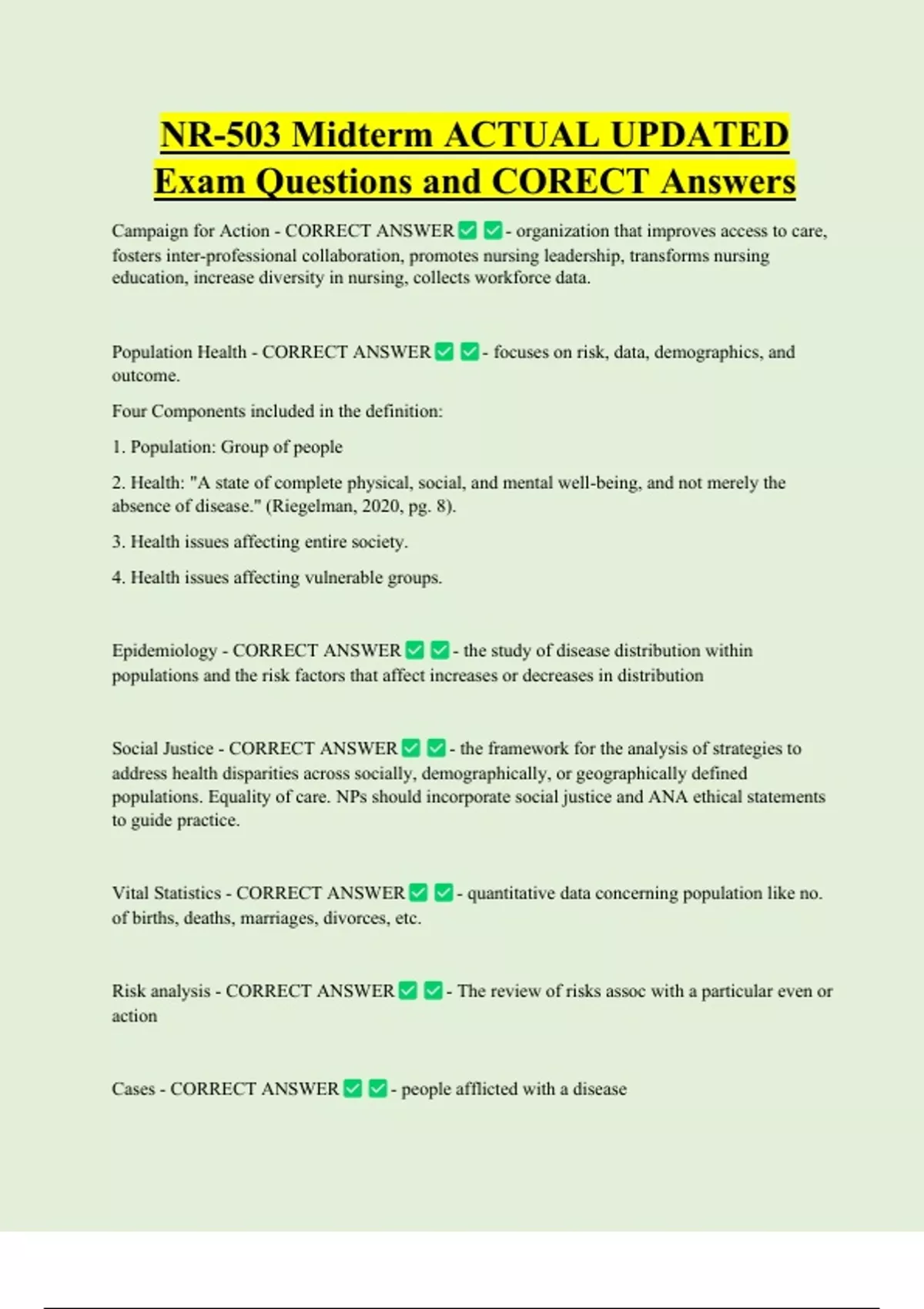 NR-503 Midterm ACTUAL UPDATED Exam Questions and CORECT Answers Campaign for Action - CORRECT ANSWER - organization that improves access to care, fosters inter-professional collaboration, promotes nursing leadership, transforms nursing education, increase diversity in nursing, collects workforce data. Population Health - CORRECT ANSWER outcome. Four Components included in the definition: 1. Population: Group of people - focuses on risk, data, demographics, and 2. Health: "A state of complete physical, social, and mental well-being, and not merely the absence of disease." (Riegelman, 2020, pg. 8). 3. Health issues affecting entire society. 4. Health issues affecting vulnerable group