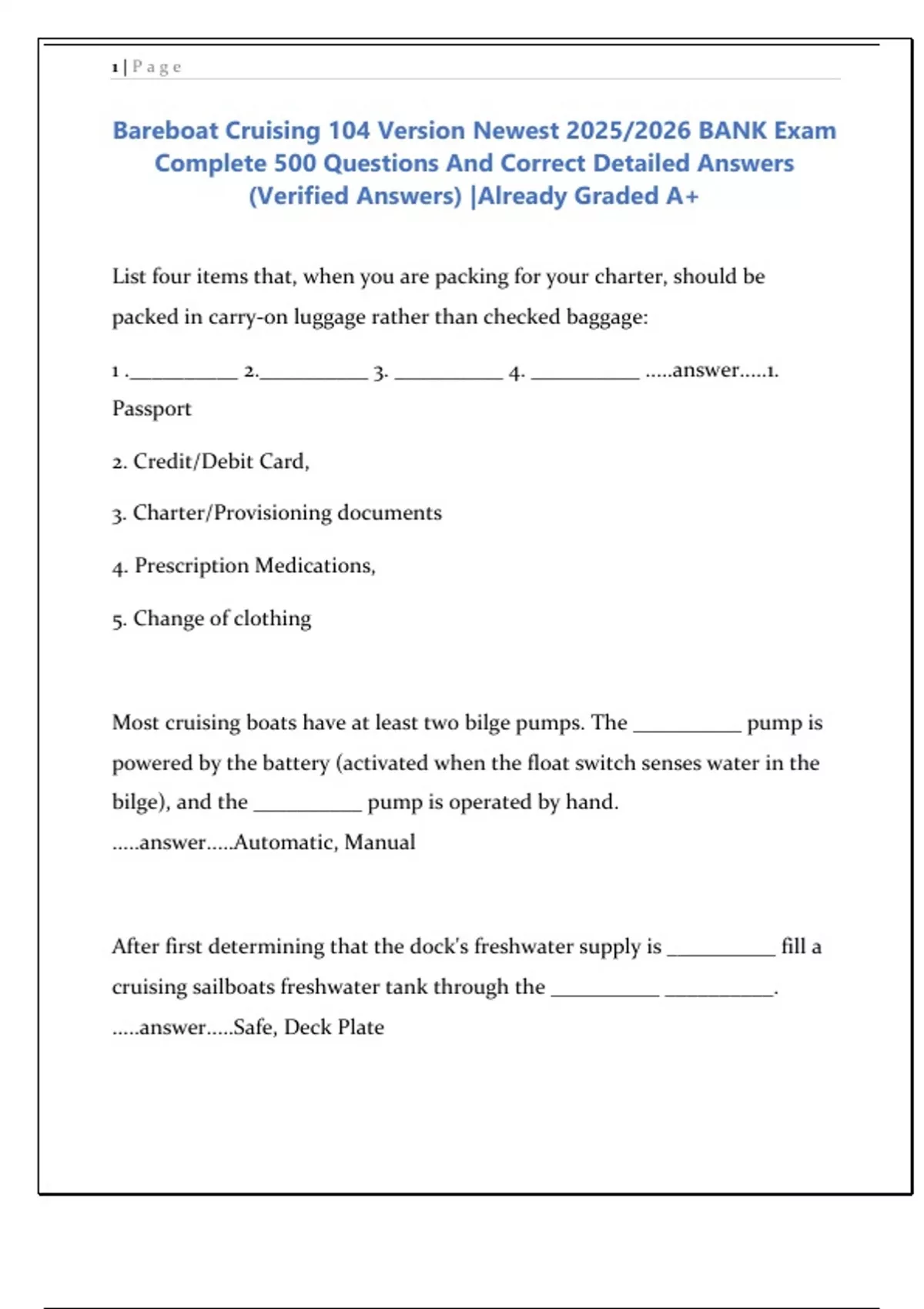 Bareboat Cruising 104 Version Newest 2025/2026 BANK Exam Complete 500 Questions And Correct Detailed Answers (Verified Answers) |Already Graded A+