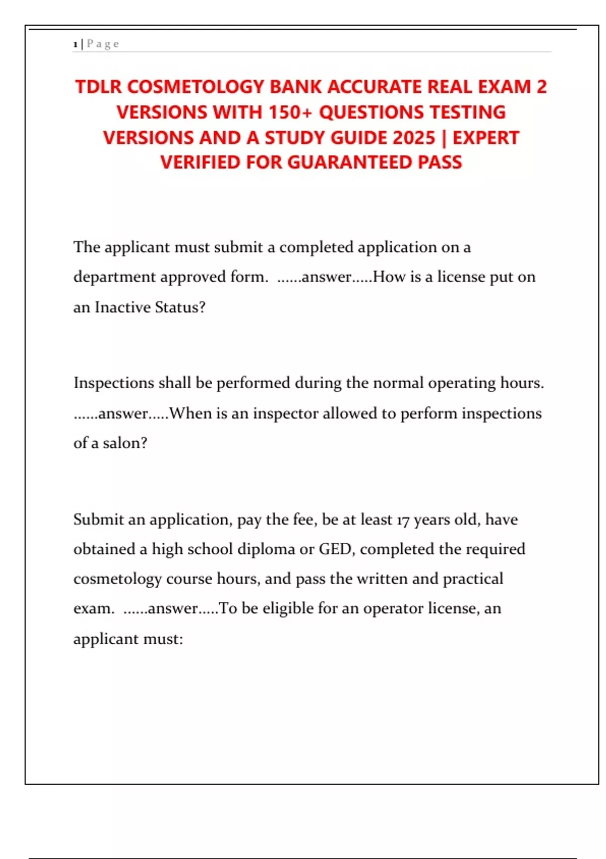 TDLR COSMETOLOGY BANK ACCURATE REAL EXAM 2 VERSIONS WITH 150+ QUESTIONS TESTING VERSIONS AND A STUDY GUIDE 2025 | EXPERT VERIFIED FOR GUARANTEED PASS