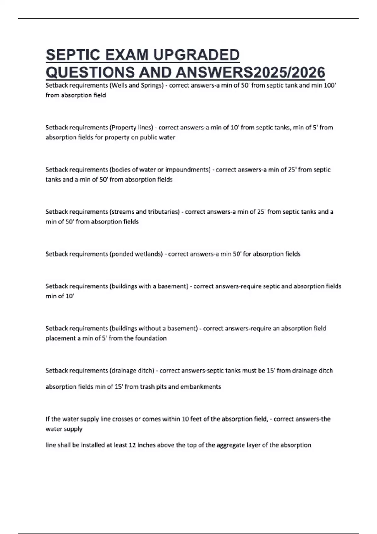 SEPTIC EXAM UPGRADED QUESTIONS AND ANSWERS2025/2026 Setback requirements (Wells and Springs) - correct answers-a min of 50' from septic tank and min 100' from absorption field Setback requirements (Property lines) - correct answers-a min of 10' from septic tanks, min of 5' from absorption fields for property on public water Setback requirements (bodies of water or impoundments) - correct answers-a min of 25' from septic tanks and a min of 50' from absorption fields Setback requirements (streams and tributaries) - correct answers-a min of 25' from septic tanks and a min of 50' from absorption fields Setback requirements (ponded wetlands) - correct answers-a min 50' for absorption fields Setback requirements (buildings with a basement) - correct answers-require septic and absorption fields min of 10' Setback requirements (buildings without a basement) - correct answers-require an absorption field placement a min of 5' from the foundation Setback requirements (drainage ditch) - correct answers-septic tanks must be 15' from drainage ditch absorption fields min of 15' from trash pits and embankments If the water supply line crosses or comes within 10 feet of the absorption field, - correct answers-the water supply line shall be installed at least 12 inches above the top of the aggregate layer of the absorption