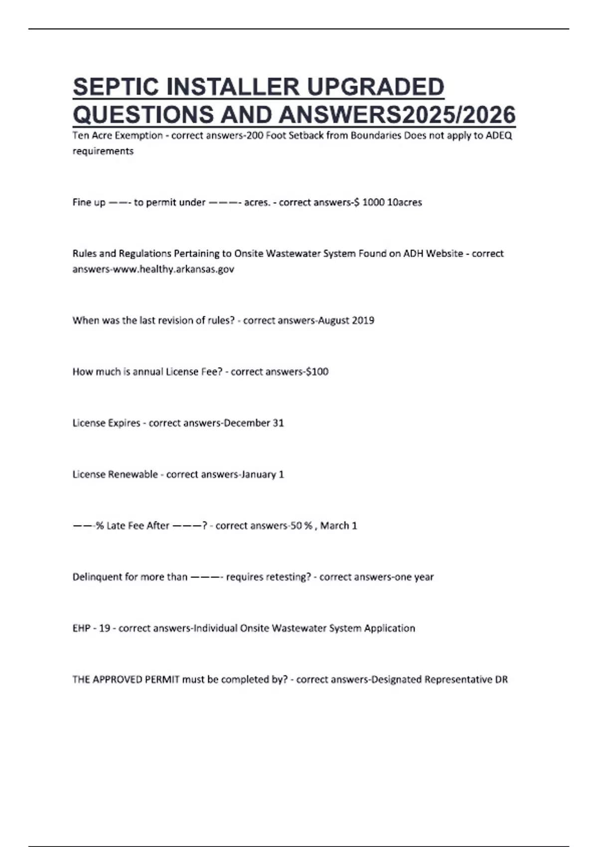 SEPTIC INSTALLER UPGRADED QUESTIONS AND ANSWERS2025/2026 Ten Acre Exemption - correct answers-200 Foot Setback from Boundaries Does not apply to ADEQ requirements Fine up ——- to permit under ———- acres. - correct answers-$ 1000 10acres Rules and Regulations Pertaining to Onsite Wastewater System Found on ADH Website - correct When was the last revision of rules? - correct answers-August 2019 How much is annual License Fee? - correct answers-$100 License Expires - correct answers-December 31 License Renewable - correct answers-January 1 ——-% Late Fee After ———? - correct answers-50 % , March 1 Delinquent for more than ———- requires retesting? - correct answers-one year EHP - 19 - correct answers-Individual Onsite Wastewater System Application THE APPROVED PERMIT must be completed by? - correct answers-Designated Representative DR