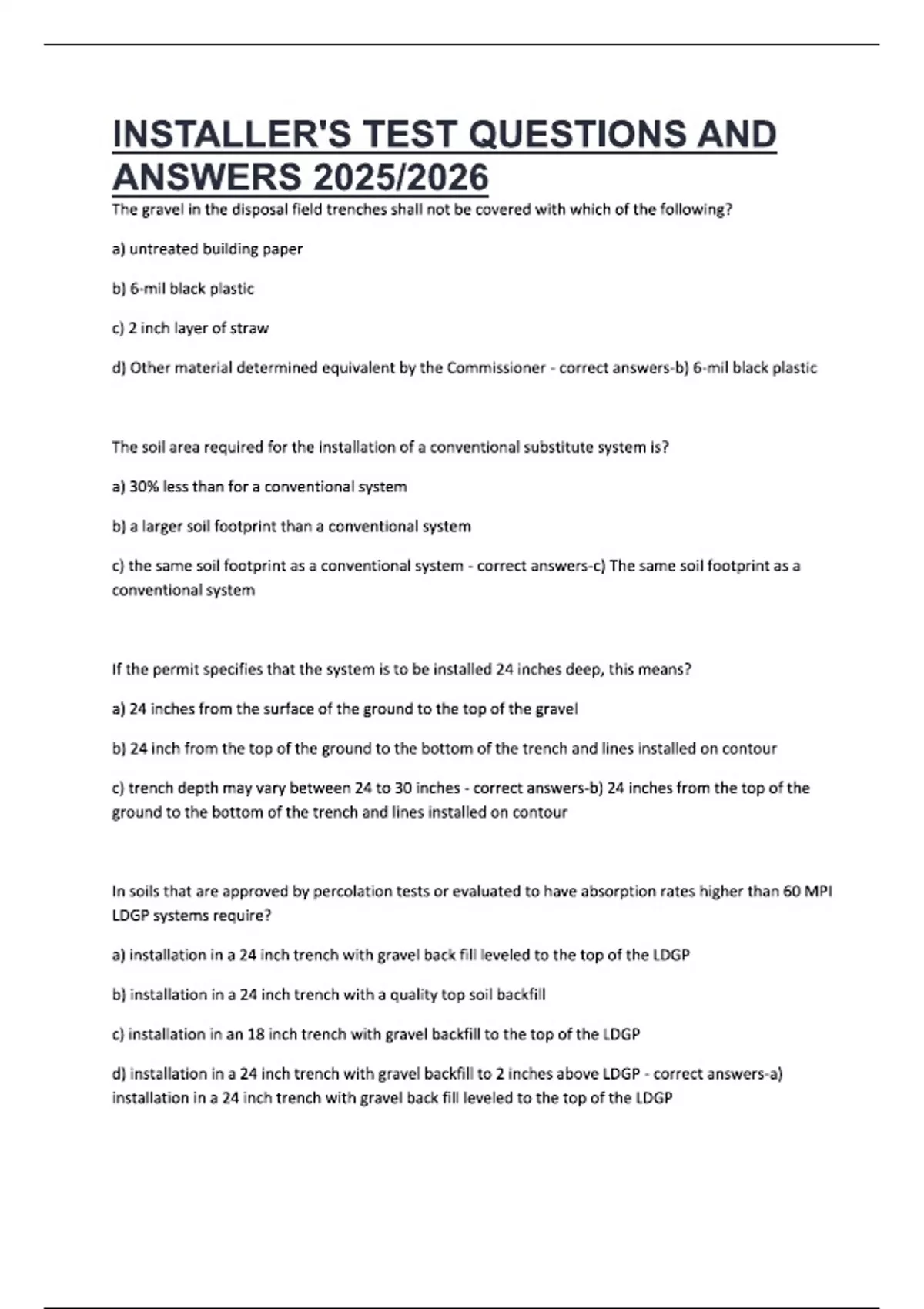 INSTALLER'S TEST QUESTIONS AND ANSWERS 2025/2026 The gravel in the disposal field trenches shall not be covered with which of the following? a) untreated building paper b) 6-mil black plastic c) 2 inch layer of straw d) Other material determined equivalent by the Commissioner - correct answers-b) 6-mil black plastic The soil area required for the installation of a conventional substitute system is? a) 30% less than for a conventional system b) a larger soil footprint than a conventional system c) the same soil footprint as a conventional system - correct answers-c) The same soil footprint as a conventional system If the permit specifies that the system is to be installed 24 inches deep, this means? a) 24 inches from the surface of the ground to the top of the gravel b) 24 inch from the top of the ground to the bottom of the trench and lines installed on contour c) trench depth may vary between 24 to 30 inches - correct answers-b) 24 inches from the top of the ground to the bottom of the trench and lines installed on contour In soils that are approved by percolation tests or evaluated to have absorption rates higher than 60 MPI LDGP systems require? a) installation in a 24 inch trench with gravel back fill leveled to the top of the LDGP b) installation in a 24 inch trench with a quality top soil backfill c) installation in an 18 inch trench with gravel backfill to the top of the LDGP d) installation in a 24 inch trench with gravel backfill to 2 inches above LDGP - correct answers-a) installation in a 24 inch trench with gravel back fill leveled to the top of the LDGP