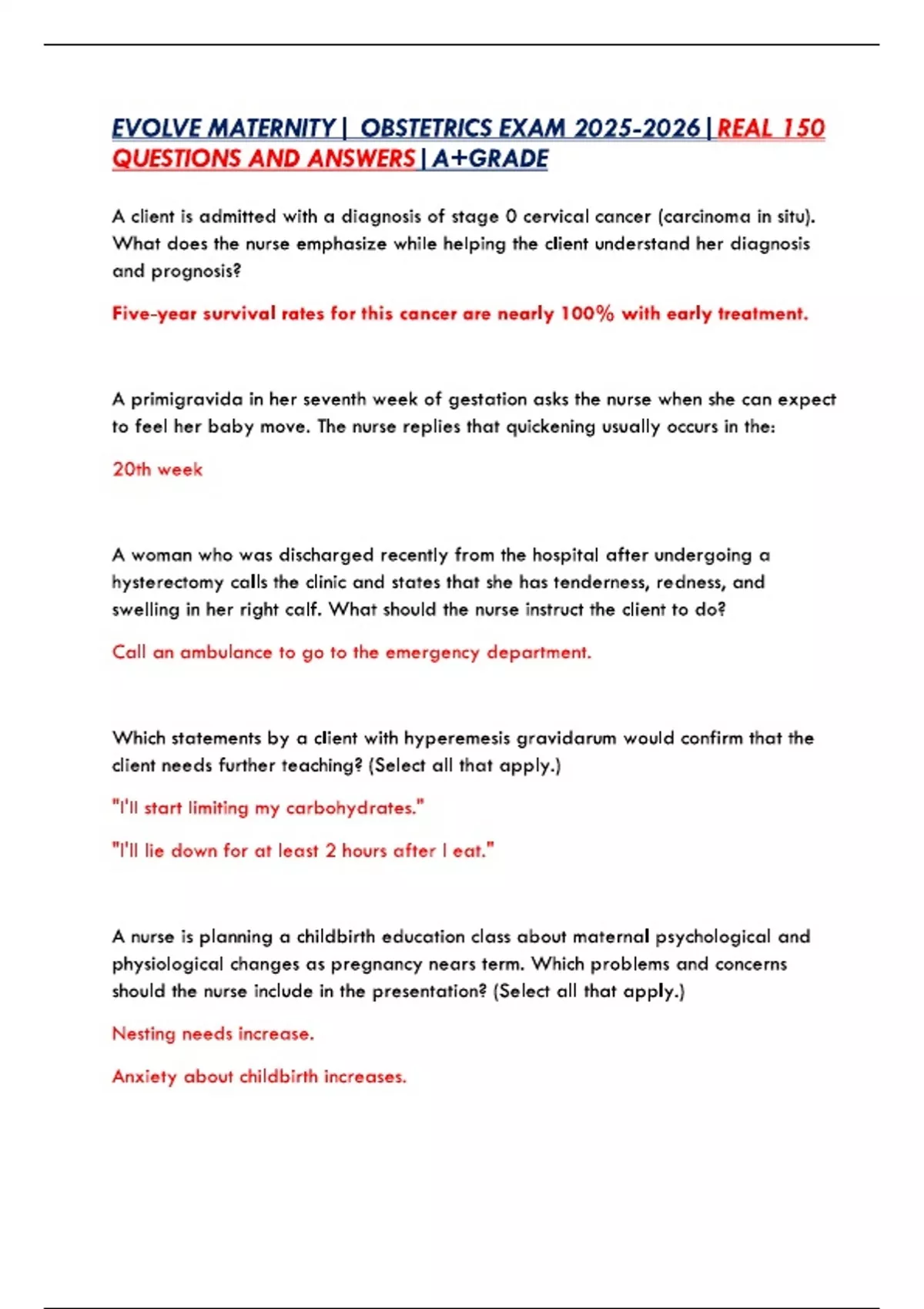 EVOLVE MATERNITY| OBSTETRICS EXAM |REAL 150 QUESTIONS AND ANSWERS|A+GRADE