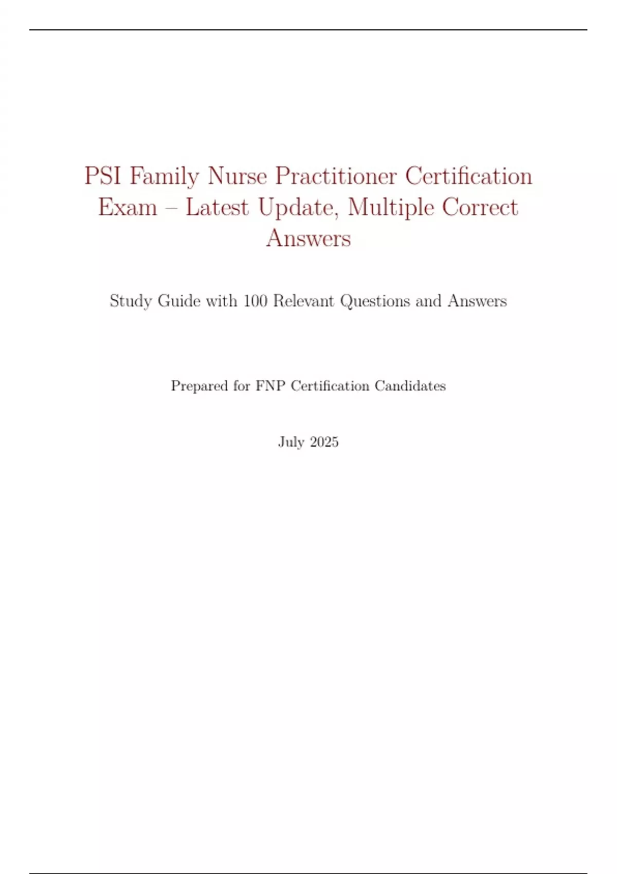 PSI Family Nurse Practitioner Certification Exam – Latest Update, Multiple Correct Answers Study Guide with 100 Relevant Questions and Answers Prepared for FNP Certification Candidates July 2025 Introduction This study guide is designed to help candidates prepare for the PSI Family Nurse Practitioner (FNP) Certification Exam, aligned with the latest 2025 updates from the American Nurses Credentialing Center (ANCC) and the American Academy of Nurse Practitioners Certification Board (AANPCB). It focuses on high-yield, clinically relevant questions with concise explanations to enhance understanding and retention. The guide includes 100 carefully crafted multiple-choice questions with answers and rationales, covering key domains such as health assessment, diagnosis, management, pharmacology, and professional issues. The content is streamlined to reduce unnecessary complexity while ensuring comprehensive coverage of exam topics.