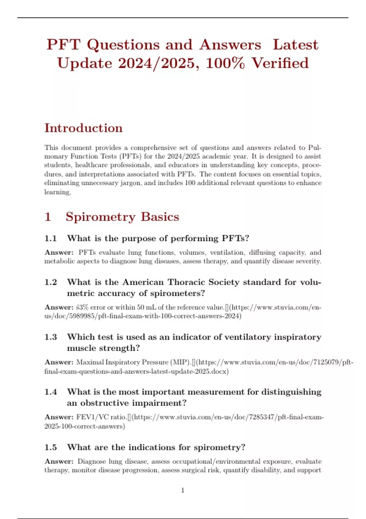 PFT Questions and Answers Latest Update 2024/2025, 100% Verified Introduction This document provides a comprehensive set of questions and answers related to Pulmonary Function Tests (PFTs) for the 2024/2025 academic year. It is designed to assist students, healthcare professionals, and educators in understanding key concepts, procedures, and interpretations associated with PFTs. The content focuses on essential topics, eliminating unnecessary jargon, and includes 100 additional relevant questions to enhance learning.