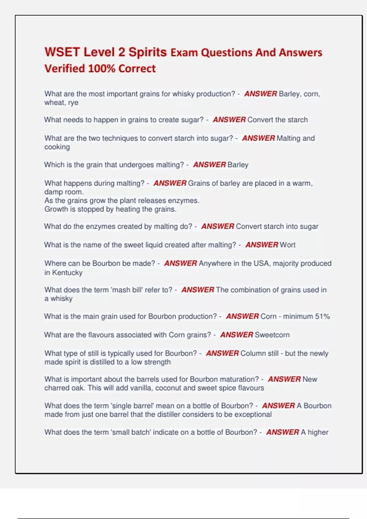 WSET Level 2 Spirits Exam Questions And Answers Verified 100% Correct What are the most important grains for whisky production? - ANSWER Barley, corn, wheat, rye What needs to happen in grains to create sugar? - ANSWER Convert the starch What are the two techniques to convert starch into sugar? - ANSWER Malting and cooking Which is the grain that undergoes malting? - ANSWER Barley What happens during malting? - ANSWER Grains of barley are placed in a warm, damp room. As the grains grow the plant releases enzymes. Growth is stopped by heating the grains. What do the enzymes created by malting do? - ANSWER Convert starch into sugar What is the name of the sweet liquid created after malting? - ANSWER Wort Where can be Bourbon be made? - ANSWER Anywhere in the USA, majority produced in Kentucky What does the term 'mash bill' refer to? - ANSWER The combination of grains used in a whisky What is the main grain used for Bourbon production? - ANSWER Corn - minimum 51% What are the flavours associated with Corn grains? - ANSWER Sweetcorn What type of still is typically used for Bourbon? - ANSWER Column still - but the newly made spirit is distilled to a low strength What is important about the barrels used for Bourbon maturation? - ANSWER New charred oak. This will add vanilla, coconut and sweet spice flavours What does the term 'single barrel' mean on a bottle of Bourbon? - ANSWER A Bourbon made from just one barrel that the distiller considers to be exceptional What does the term 'small batch' indicate on a bottle of Bourbon? - ANSWER A higher quality product made from a small number of selected casks What does the term 'straight' indicate on a bottle of Bourbon? - ANSWER The whiskey has been matured for at least two years in new oak barrels and that no colour or flavour has been added Where can Tennessee Whiskey be made? - ANSWER Tennessee What is the additional process required for Tennessee Whiskey? - ANSWER The Lincoln County Process - the newly made spirit is filtered through charcoal before it is aged What does the term 'sour mash' indicate on a bottle of Tennessee Whiskey? - ANSWER The acidic residue at the base of the column still from previous distillation has been added back to the fermenter What is the main grain used for Rye Whiskey production? - ANSWER Rye - minimum 51% What are the flavours associated with Rye grains? - ANSWER Spicy, lemon-zest, rye bread What is typically blended in Canadian Whisky? - ANSWER Small amounts of pronounced whisky (flavouring whisky) made from Rye are blended with light-flavoured, high strength whisky made from corn What is important for the production of Single Malt Scotch Whisky? - ANSWER Must be the product of one distillery, made using malted barley, distilled in a pot still, matured in oak for three years What is peat? - ANSWER Partly decayed vegetation What part of the distillation process is peat used in? - ANSWER As the fuel to heat the grains at the end of malting What effect does the shape and height of the still have on the whisky produced? - ANSWER Short stills produce spirits with more pronounced aromas, tall stills produce a lighter style Where do the majority of oak barrels used in Scotland come from? - ANSWER USA - ex-bourbon What is 'wood finishing' in Single Malt Scotch Whisky production? - ANSWER The whisky is moved into a different barrel for a short amount of time at the end of maturation. The barrels have previously contained a wine or spirit (e.g. Port or Sherry) which will add flavour and sometimes colour to the whisky What is important for the production of Blended Scotch Whisky? - ANSWER It is a blend of malt whisky and grain whisky from different distilleries. The grain whisky is distilled to a high strength in a column still What are the five whisky regions of Scotland? - ANSWER Islay, Highland, Campbeltown, Speyside, Lowland What does the age indication on a bottle of Scotch Whisky indicate? - ANSWER The youngest whisky used in the blend What does the term 'natural colour' mean on a bottle of Whisky? - ANSWER The distiller has not used caramel to enhance the colour What does the term 'cask strength' mean on a Whisky? - ANSWER The whisky has been bottled undiluted What is a feature of some Irish Whiskey? - ANSWER Use of unmalted barley. Adds spice, fruit and oily aromas What type of whiskies are made in Japan? - ANSWER Grain whiskies in column stills and malt whiskies in pot stills for both malt and blended whisky What is the raw material for rum? - ANSWER Sugar cane What are the two main sugar cane products used for rum? - ANSWER Sugar cane juice and molasses What are the aromas associated with rums made from sugar cane juice? - ANSWER Vegetal, grassy and fruity aromas What must happen to molasses before it can be used for rum production? - ANSWER It must be diluted with water What is the term used to describe Jamaican rums with exaggerated fruity aromas? - ANSWER High-ester What does the term 'light mark' mean in rum production? - ANSWER Rum that is distilled to relatively high strength (over 90% abv). They are made in column stills and have light intensity What does the term 'heavy mark' mean in rum production? - ANSWER Rum that is distilled to a relatively low strength. They are normally made in pot stills, although there is a wide variety of stills used.