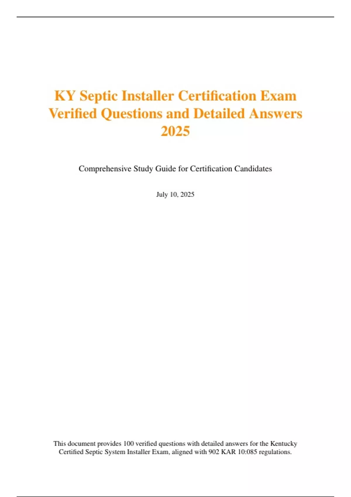 KYSeptic Installer Certification Exam Verified Questions and Detailed Answers 2025 Comprehensive Study Guide for Certification Candidates July 10, 2025 ExamOverview This study guide prepares candidates for the 2025 Kentucky Certified Septic System Installer Exam, administered by local health departments under 902 KAR 10:085. The open-book exam requires a 70