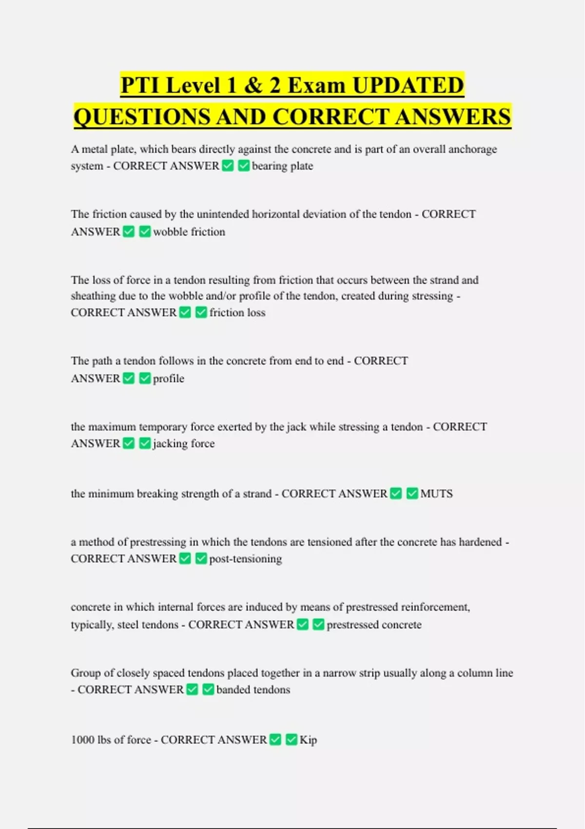 PTI Level 1 & 2 Exam UPDATED QUESTIONS AND CORRECT ANSWERS A metal plate, which bears directly against the concrete and is part of an overall anchorage system - CORRECT ANSWER bearing plate The friction caused by the unintended horizontal deviation of the tendon - CORRECT ANSWER wobble friction The loss of force in a tendon resulting from friction that occurs between the strand and sheathing due to the wobble and/or profile of the tendon, created during stressing - CORRECT ANSWER friction loss