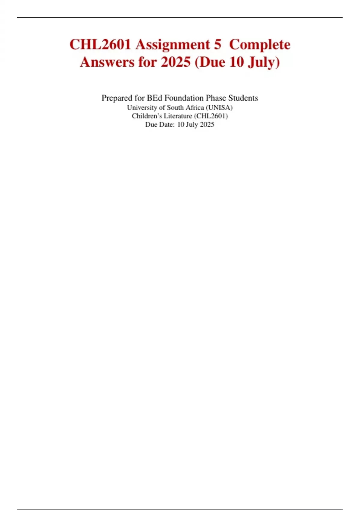 CHL2601 Assignment 5 Complete Answers for 2025 (Due 10 July) Prepared for BEd Foundation Phase Students University of South Africa (UNISA) Children’s Literature (CHL2601) Due Date: 10 July 2025 Introduction This document is a comprehensive resource for CHL2601 Assignment 5 (2025) for BEd Foundation Phase students at the University of South Africa (UNISA). It addresses core questions from the assignment and includes 100 additional questions and answers to deepen understanding of children’s literature. The focus is on practical, engaging, and culturally relevant content, tailored to the South African context, with minimal jargon and maximum clarity. Topics include literacy development, genres, teaching strategies, and fostering a love for reading in young learners. 2 Core Assignment Questions and Answers This section provides clear, concise answers to the key questions expected in CHL2601 Assignment 5, based on the 2025 curriculum, emphasizing practical applications in children’s literature.