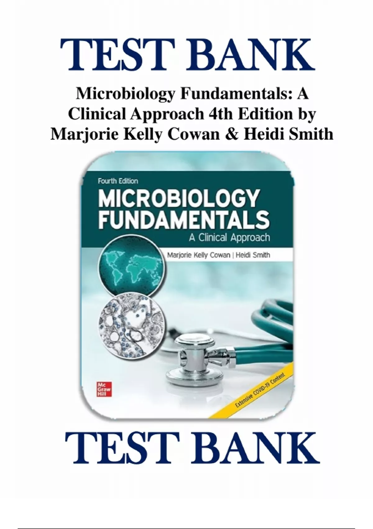 Test Bank for Microbiology Fundamentals: A Clinical Approach, 4th Edition, Marjorie Kelly Cowan, Heidi Smith, ISBN10: X, ISBN13: 2439 Table of Contents 1 Introduction to Microbes and Their Building Blocks 2 Tools of the Laboratory: Methods for the Culturing and Microscopic Analysis of Microorganisms 3 Bacteria and Archaea 4 Eukaryotic Cells and Microorganisms 5 Viruses and Prions 6 Microbial Nutrition and Growth 7 Microbial Metabolism 8 Microbial Genetics and Genetic Engineering 9 Physical and Chemical Control of Microbes 10 Antimicrobial Treatment 11 Interactions Between Microbes and Humans 12 Host Defenses I: Overview and Innate Defenses 13 Host Defenses II: Adaptive Immunity and Immunization 14 Disorders in Immunity 15 Diagnosing Infections 16 Infectious Diseases Affecting the Skin and Eyes 17 Infectious Diseases Affecting the Nervous System 18 Infectious Diseases Affecting the Cardiovascular and Lymphatic Systems 19 Infectious Diseases Affecting the Respiratory Systems 20 Infectious Diseases Affecting the Gastrointestinal Tract 21 Infectious Diseases Affecting the Genitourinary System 22 One Health: The Interconnected Health of the Environment, Humans, and Other Animals