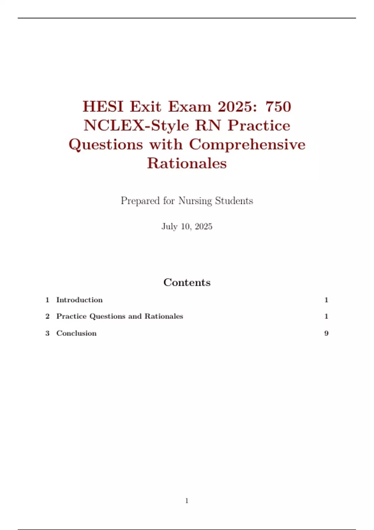 HESI Exit Exam 2025: 750 NCLEX-Style RN Practice Questions with Comprehensive Rationales Prepared for Nursing Students Introduction This document provides a focused set of 100 NCLEX-style practice questions with clear, concise rationales for the HESI Exit Exam 2025, representing a subset of the 750 questions referenced in the title. Designed for nursing students, the content emphasizes critical thinking and clinical decision-making, aligned with NCLEX-RN competencies, without unnecessary complexity.