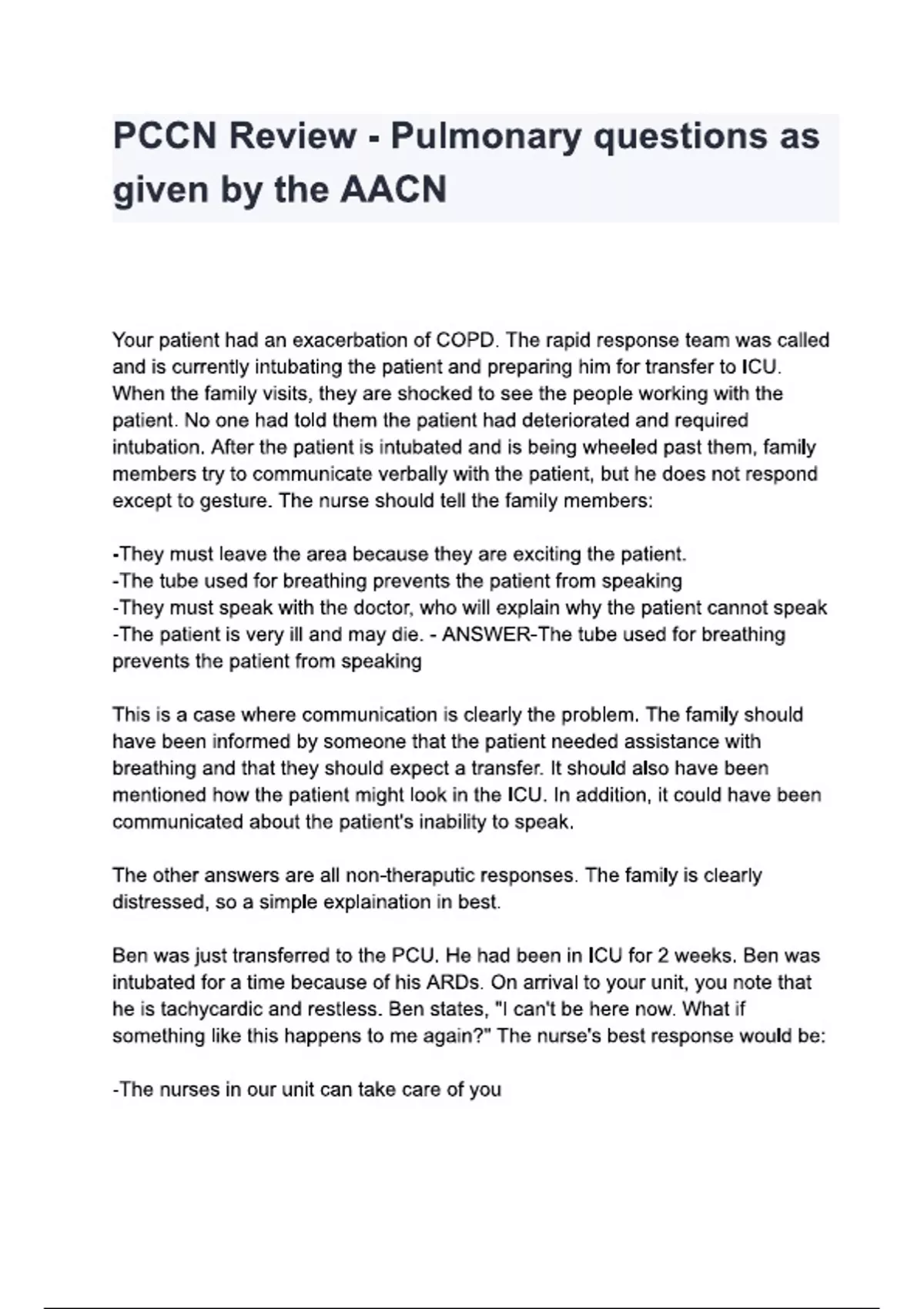 PCCN Review - Pulmonary questions as given by the AACN questions and answers