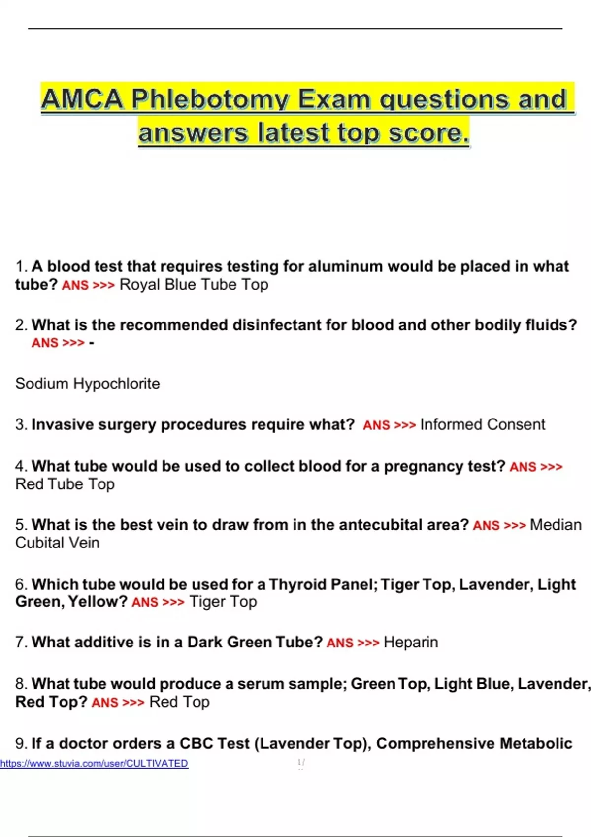8. What tube would produce a serum sample; Green Top, Light Blue, Lavender,