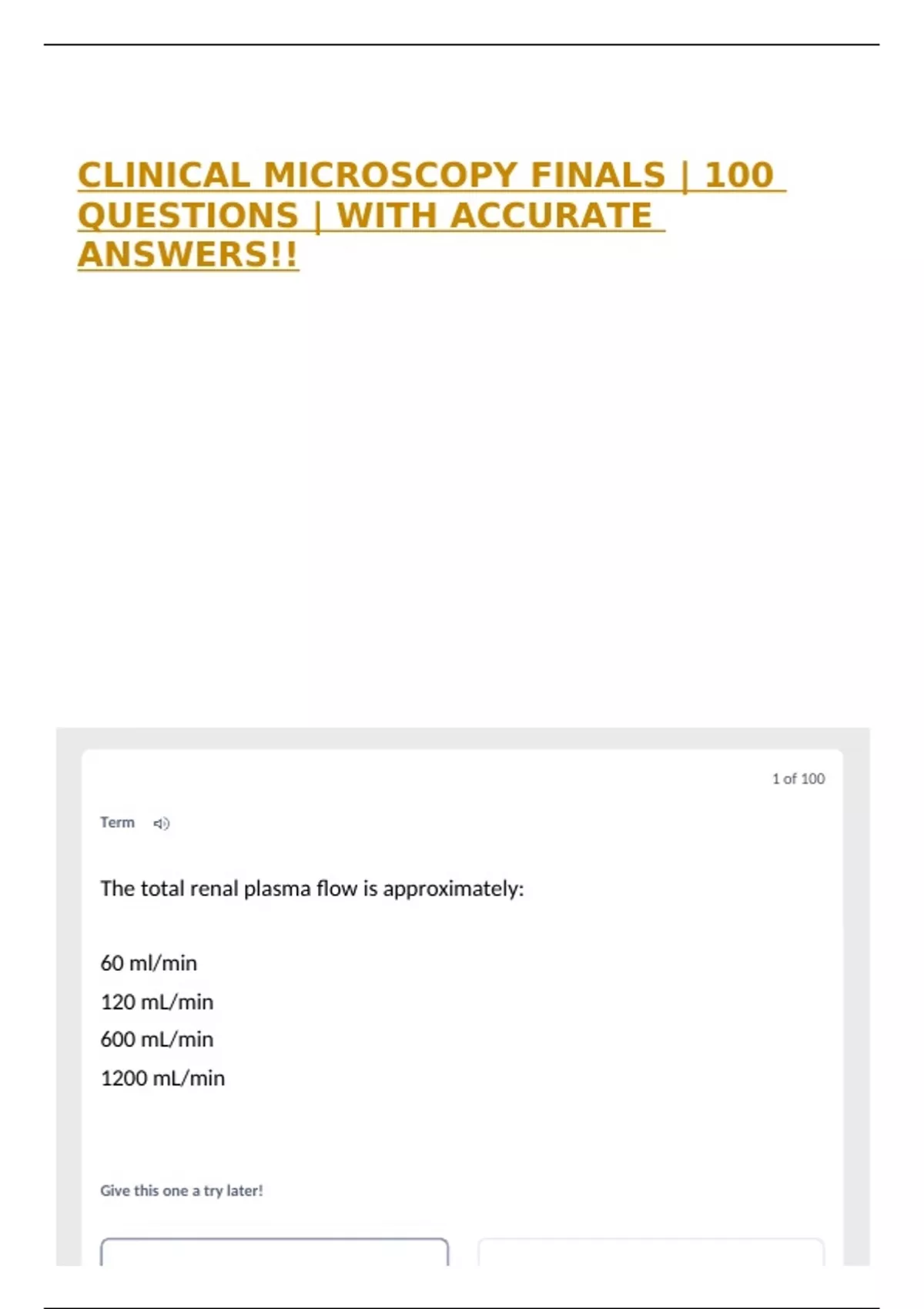 CLINICAL MICROSCOPY FINALS | 100 QUESTIONS | WITH ACCURATE ANSWERS!!