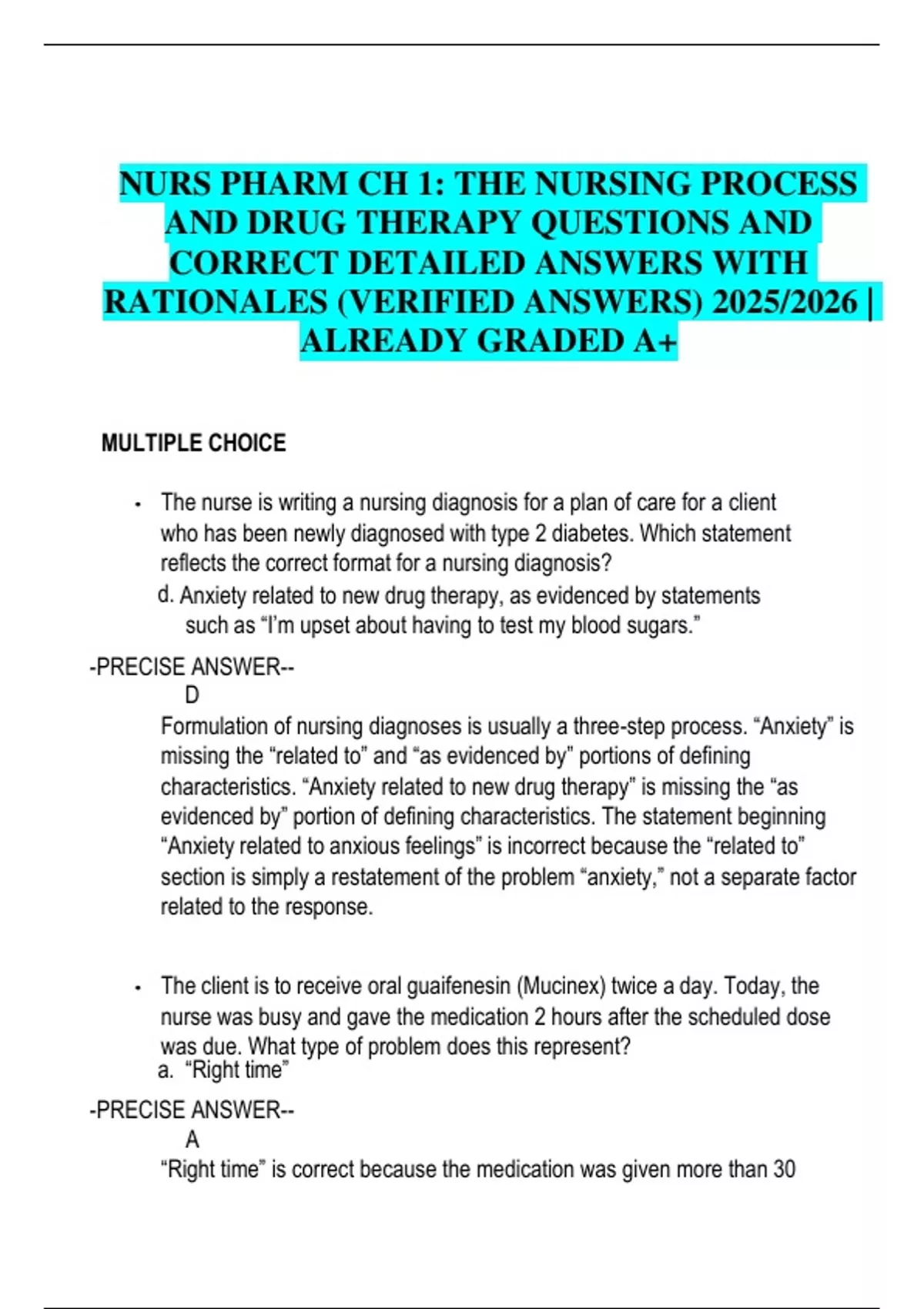 NURS PHARM CH 1: THE NURSING PROCESS AND DRUG THERAPY QUESTIONS AND CORRECT DETAILED ANSWERS WITH RATIONALES (VERIFIED ANSWERS) 2025/2026 | ALREADY GRADED A+