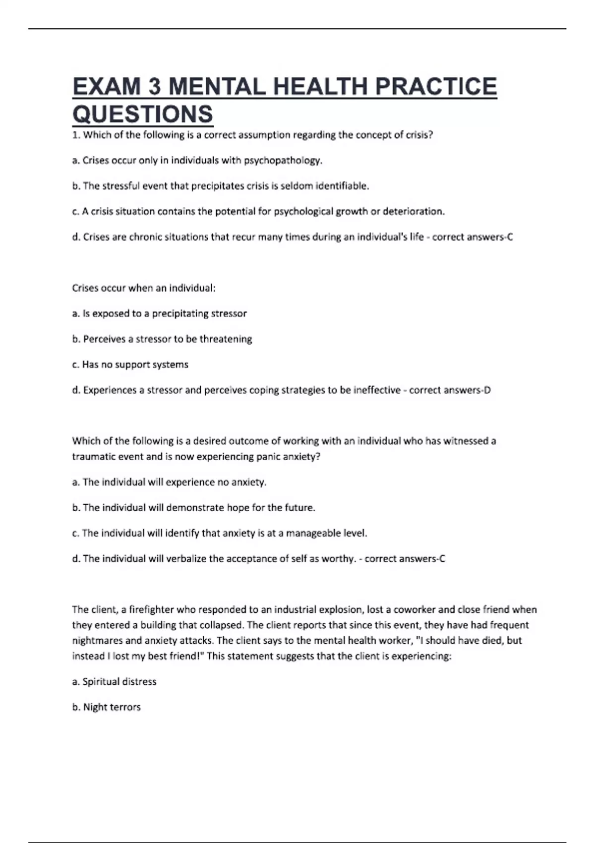 EXAM 3 MENTAL HEALTH PRACTICE QUESTIONS 1. Which of the following is a correct assumption regarding the concept of crisis? a. Crises occur only in individuals with psychopathology. b. The stressful event that precipitates crisis is seldom identifiable. c. A crisis situation contains the potential for psychological growth or deterioration. d. Crises are chronic situations that recur many times during an individual's life - correct answers-C Crises occur when an individual: a. Is exposed to a precipitating stressor b. Perceives a stressor to be threatening c. Has no support systems d. Experiences a stressor and perceives coping strategies to be ineffective - correct answers-D Which of the following is a desired outcome of working with an individual who has witnessed a traumatic event and is now experiencing panic anxiety? a. The individual will experience no anxiety. b. The individual will demonstrate hope for the future. c. The individual will identify that anxiety is at a manageable level. d. The individual will verbalize the acceptance of self as worthy. - correct answers-C The client, a firefighter who responded to an industrial explosion, lost a coworker and close friend when they entered a building that collapsed. The client reports that since this event, they have had frequent nightmares and anxiety attacks. The client says to the mental health worker, "I should have died, but instead I lost my best friend!" This statement suggests that the client is experiencing: a. Spiritual distress b. Night terrors