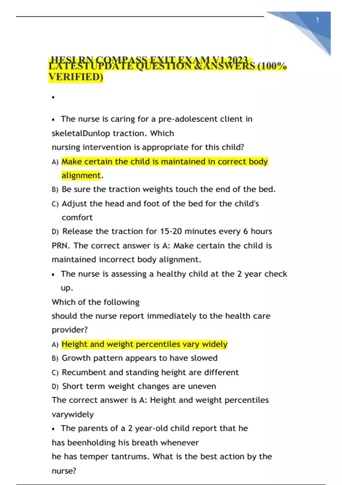 This document provides the most recent version (V1) of the HESI RN Compass Exit Exam for 2023, featuring 100% verified and correct questions and answers. It covers all major nursing topics assessed in the exam, including clinical judgment, pharmacology, medical-surgical nursing, maternity, and patient safety. Ideal for final exam preparation and NCLEX readiness, this resource ensures thorough review and confident test-taking.
