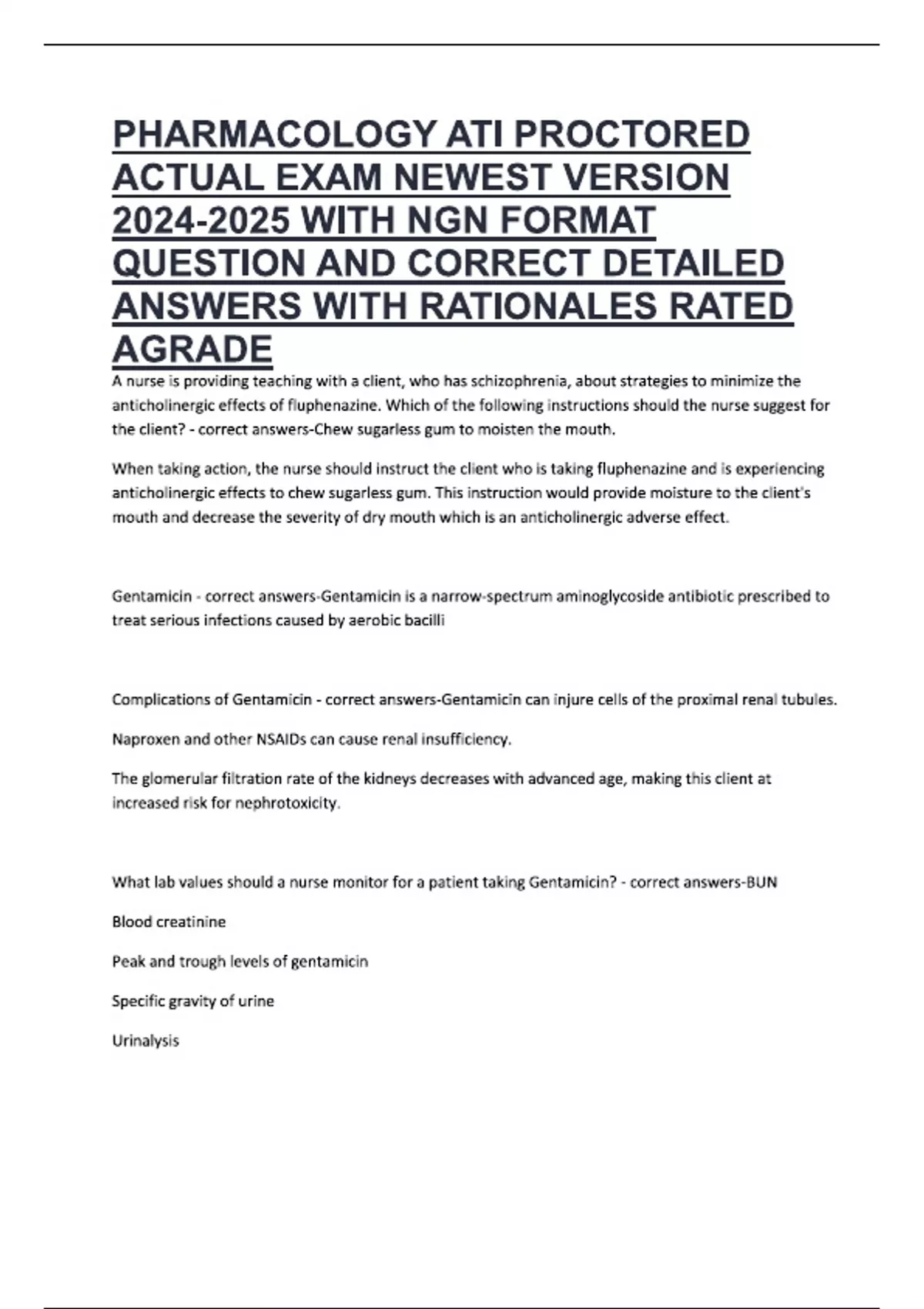 PHARMACOLOGY ATI PROCTORED ACTUAL EXAM NEWEST VERSION WITH NGN FORMAT QUESTION AND CORRECT DETAILED ANSWERS WITH RATIONALES RATED AGRADE A nurse is providing teaching with a client, who has schizophrenia, about strategies to minimize the anticholinergic effects of fluphenazine. Which of the following instructions should the nurse suggest for the client? - correct answers-Chew sugarless gum to moisten the mouth. When taking action, the nurse should instruct the client who is taking fluphenazine and is experiencing anticholinergic effects to chew sugarless gum. This instruction would provide moisture to the client's mouth and decrease the severity of dry mouth which is an anticholinergic adverse effect. Gentamicin - correct answers-Gentamicin is a narrow-spectrum aminoglycoside antibiotic prescribed to treat serious infections caused by aerobic bacilli Complications of Gentamicin - correct answers-Gentamicin can injure cells of the proximal renal tubules. Naproxen and other NSAIDs can cause renal insufficiency. The glomerular filtration rate of the kidneys decreases with advanced age, making this client at increased risk for nephrotoxicity. What lab values should a nurse monitor for a patient taking Gentamicin? - correct answers-BUN Blood creatinine Peak and trough levels of gentamicin Specific gravity of urine Urinalysis