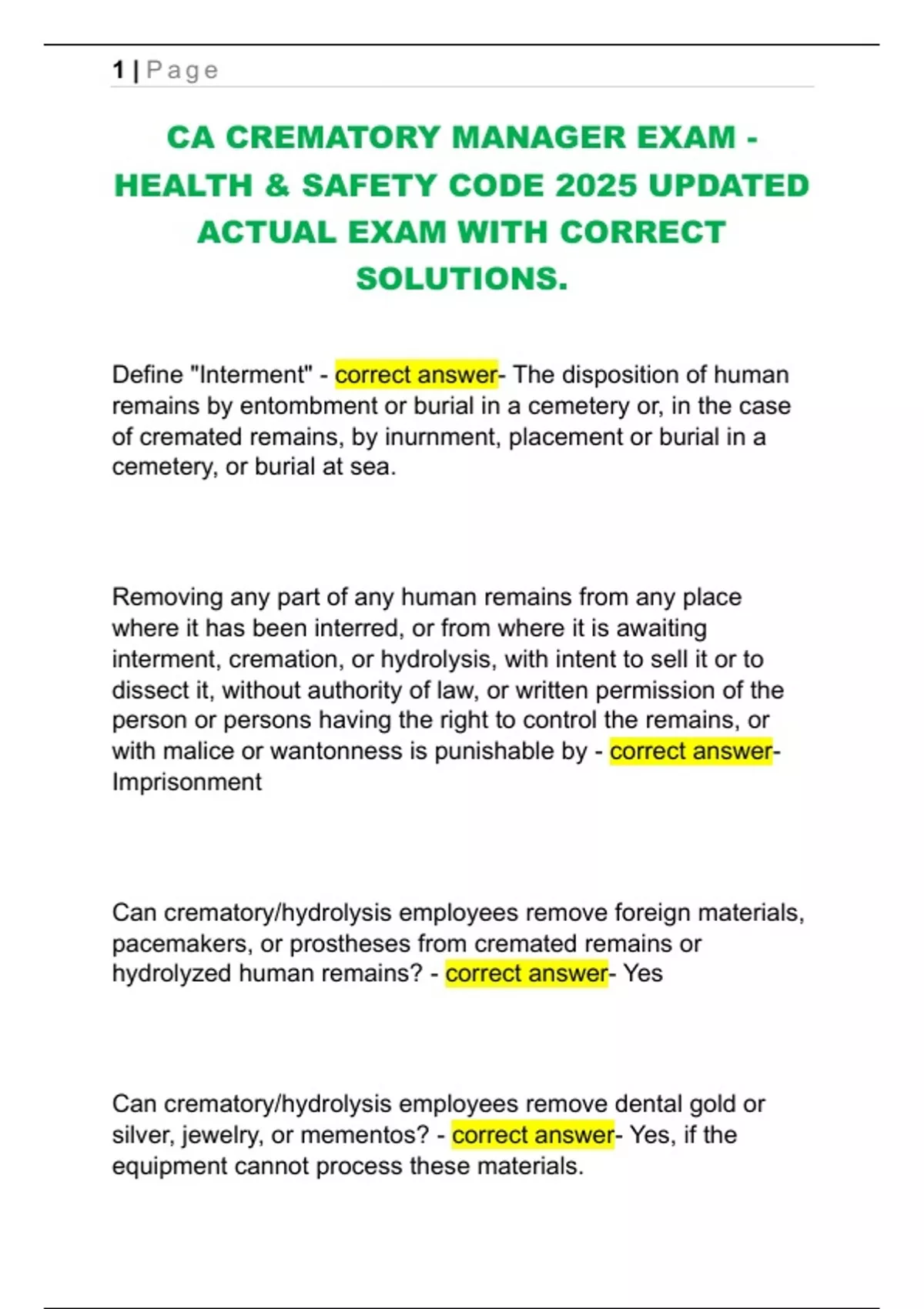 CA CREMATORY MANAGER EXAM - HEALTH & SAFETY CODE 2025 UPDATED ACTUAL EXAM WITH CORRECT SOLUTIONS.