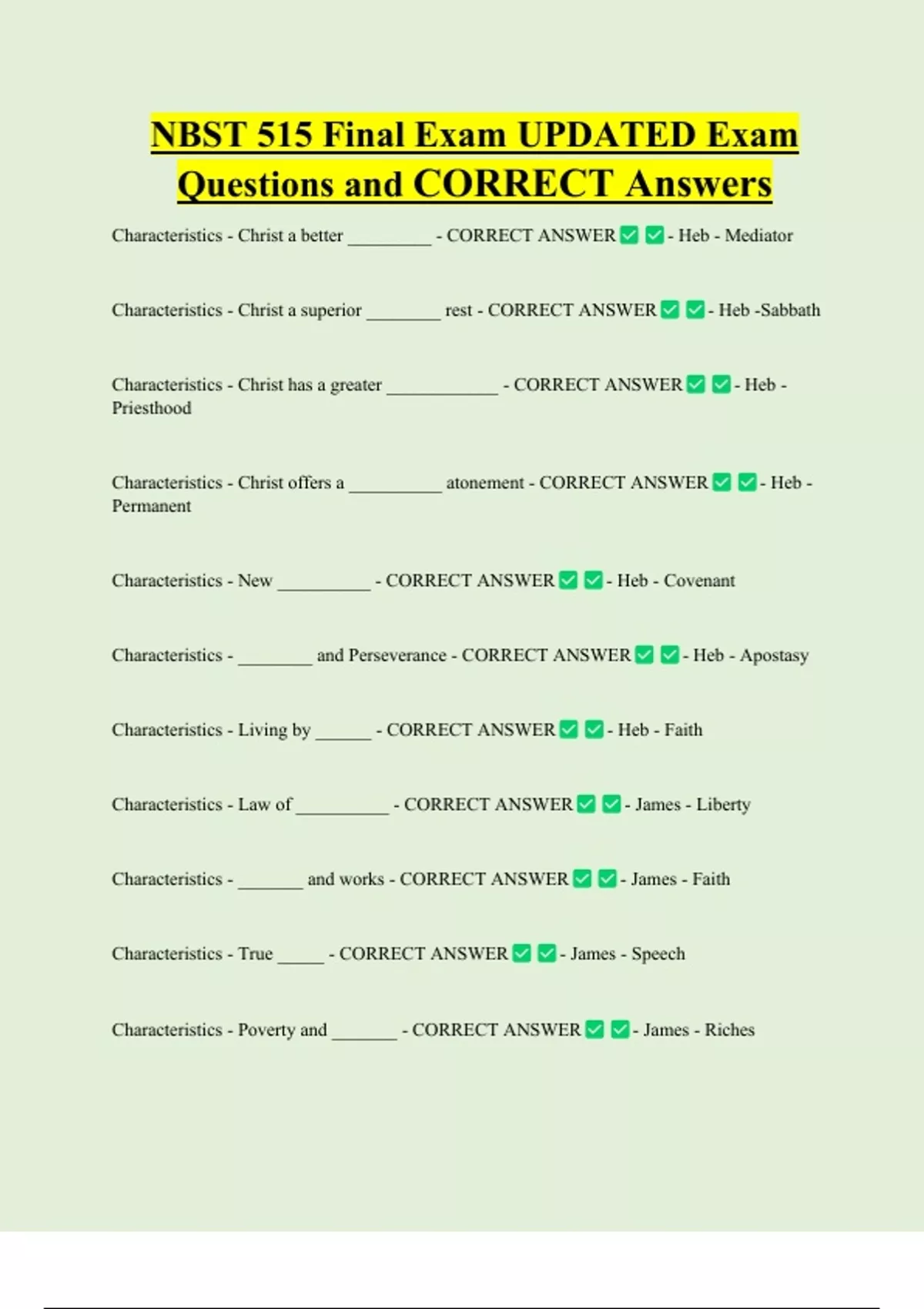 NBST 515 Final Exam UPDATED Exam Questions and CORRECT Answers Characteristics - Christ a better _________ - CORRECT ANSWER Characteristics - Christ a superior ________ rest - CORRECT ANSWER - Heb - Mediator - Heb -Sabbath Characteristics - Christ has a greater ____________ - CORRECT ANSWER Priesthood Characteristics - Christ offers a __________ atonement - CORRECT ANSWER Permanent Characteristics - New __________ - CORRECT ANSWER - Heb - - Heb -
