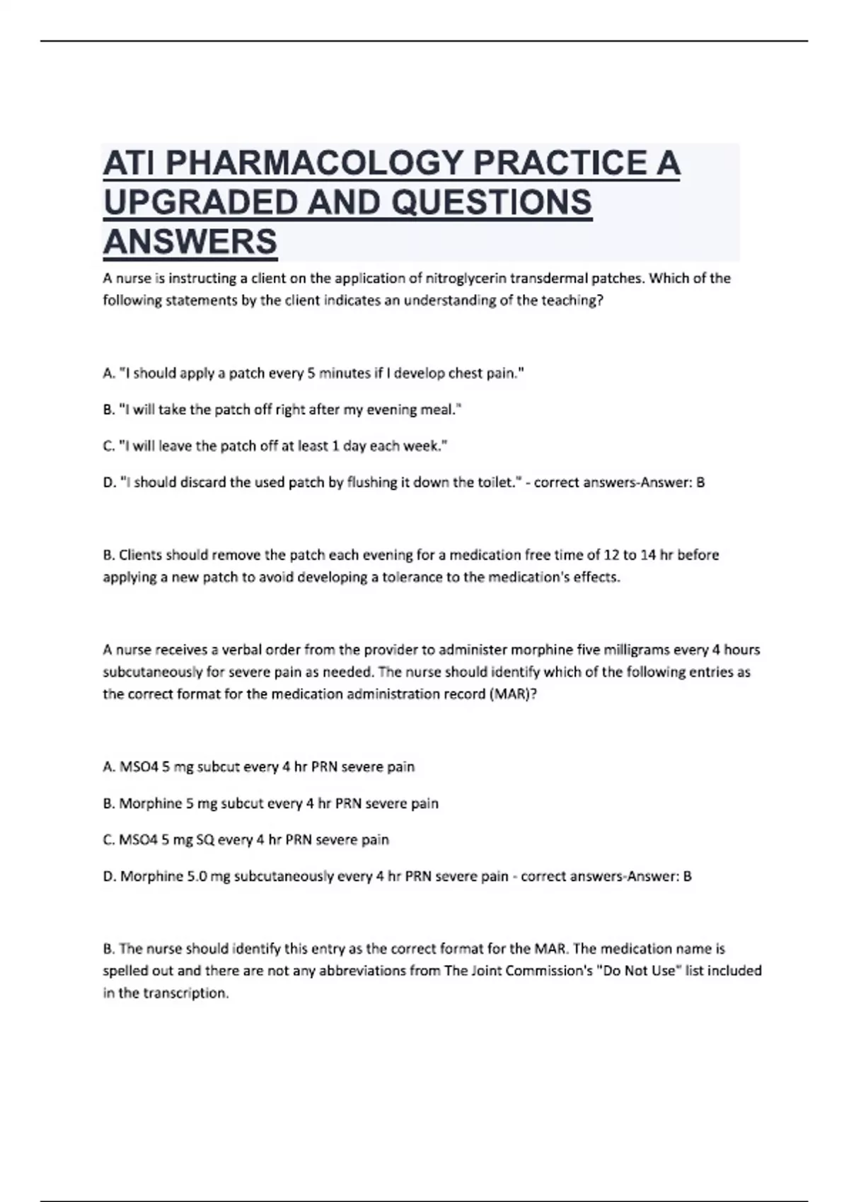ATI PHARMACOLOGY PRACTICE A UPGRADED AND QUESTIONS ANSWERS A nurse is instructing a client on the application of nitroglycerin transdermal patches. Which of the following statements by the client indicates an understanding of the teaching? A. "I should apply a patch every 5 minutes if I develop chest pain." B. "I will take the patch off right after my evening meal." C. "I will leave the patch off at least 1 day each week." D. "I should discard the used patch by flushing it down the toilet." - correct answers-Answer: B B. Clients should remove the patch each evening for a medication free time of 12 to 14 hr before applying a new patch to avoid developing a tolerance to the medication's effects. A nurse receives a verbal order from the provider to administer morphine five milligrams every 4 hours subcutaneously for severe pain as needed. The nurse should identify which of the following entries as the correct format for the medication administration record (MAR)? A. MSO4 5 mg subcut every 4 hr PRN severe pain B. Morphine 5 mg subcut every 4 hr PRN severe pain C. MSO4 5 mg SQ every 4 hr PRN severe pain D. Morphine 5.0 mg subcutaneously every 4 hr PRN severe pain - correct answers-Answer: B B. The nurse should identify this entry as the correct format for the MAR. The medication name is spelled out and there are not any abbreviations from The Joint Commission's "Do Not Use" list included in the transcription.