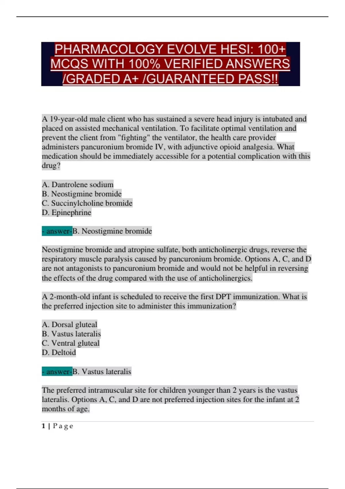 Ace Your EVOLVE HESI Pharmacology Exam with Confidence! 100% VERIFIED | GRADED A+ | GUARANTEED PASS! Struggling with drug mechanisms, side effects, or NCLEX-style questions for the Evolve HESI Pharmacology exam? This comprehensive test bank is your ultimate study weapon! Packed with 100+ high-yield MCQs, each question includes detailed rationales to master critical topics like: Neuromuscular blockers, Chemotherapy, Antibiotics, Anticoagulants Pediatric dosing, Drug interactions, Nursing priorities Lab monitoring, Toxicity signs, Patient education Why Choose This Document? 2025 Updated Content – Aligned with the latest HESI and NCLEX-RN® standards. Expert Rationales – No guesswork! Learn the why behind every answer. Perfect for NURS 320 & Similar Courses – Ideal for nursing students at any university. Quick Review & Last-Minute Prep – Target weak areas and boost your score fast!