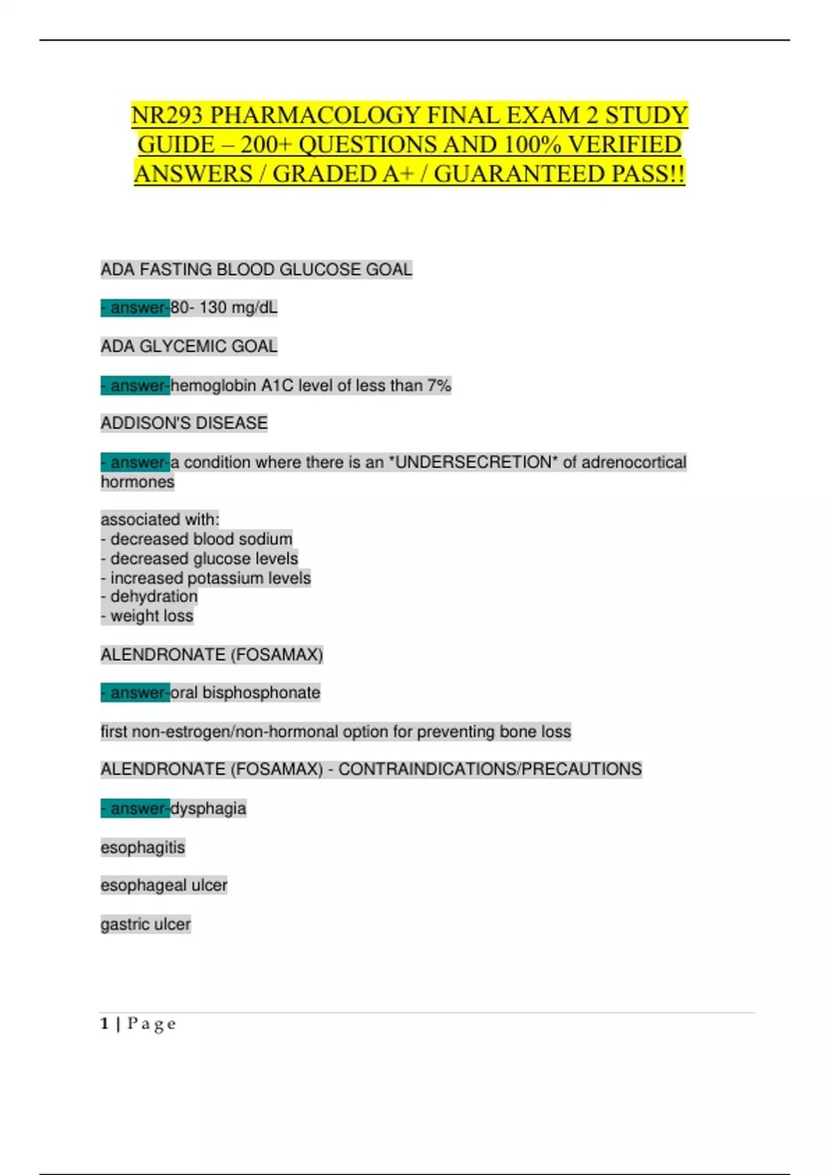Your Ultimate NR293 Final Exam Study Companion! This comprehensive 2025-updated study guide features 200+ verified questions and answers—meticulously curated to cover the most critical topics for your pharmacology final exam, including diabetes management, HIV drugs, antibiotics, thyroid disorders, and more. Perfect for nursing students who need a high-yield, quick-review resource to ensure exam success! Why This Guide is a Must-Have: NCLEX-Aligned Content: Covers essential drug classes (insulins, antiretrovirals, cephalosporins, thyroid drugs) with detailed rationales. Clinical Priority Focus: Includes nursing implications, contraindications, and patient teaching points. Real-World Readiness: Questions mimic actual exam formats, reinforcing critical thinking for clinical practice. Quick Reference: Bolded key terms and bullet-point answers for fast memorization. Trusted Accuracy: Answers verified by nursing educators—guaranteed A+ quality. Bonus Features: Mnemonic devices (e.g., "HOT AND DRY = SUGAR HIGH") for quick recall Drug interaction alerts (e.g., metronidazole + alcohol) Therapeutic ranges (e.g., ADA glycemic goals) Administration tips (e.g., mixing insulins: "clear before cloudy")