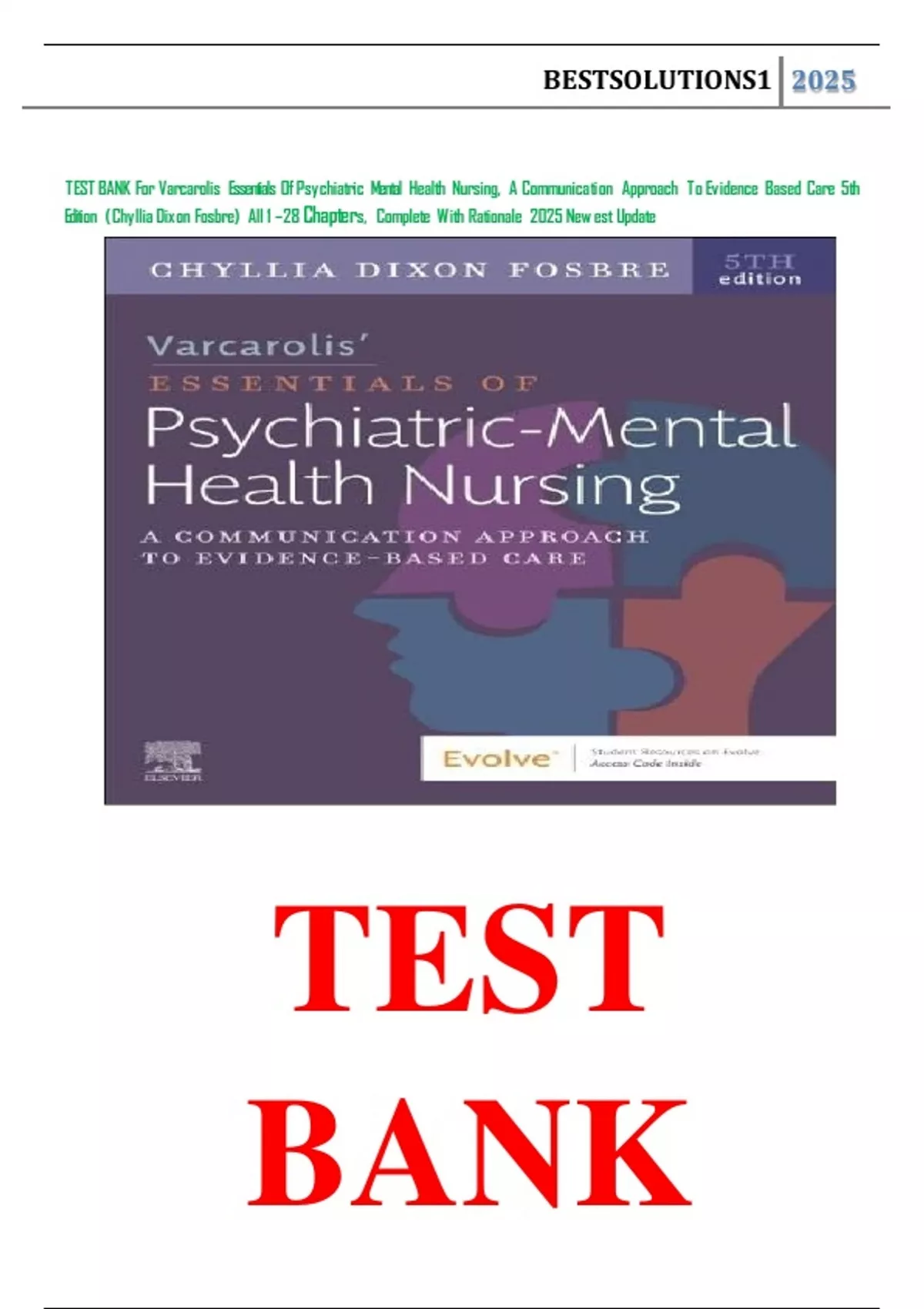 TEST BANK For Varcarolis Essentials Of Psychiatric Mental Health Nursing, A Communication Approach To Evidence Based Care 5th