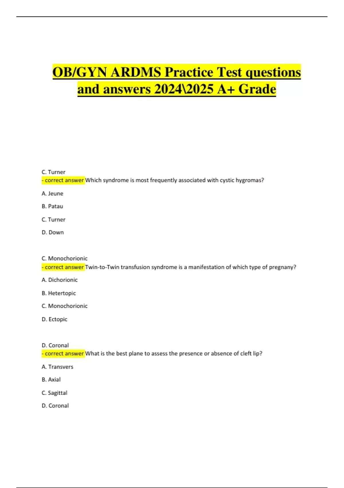 This document provides a full set of OB/GYN ARDMS practice test questions and correct answers for the 2024/2025 exam cycle. It covers essential topics in obstetrics and gynecology sonography, including fetal development, maternal health, reproductive anatomy, and diagnostic procedures. The content is ideal for students preparing for the ARDMS certification exam and ensures high-quality test prep with a verified 100% score.