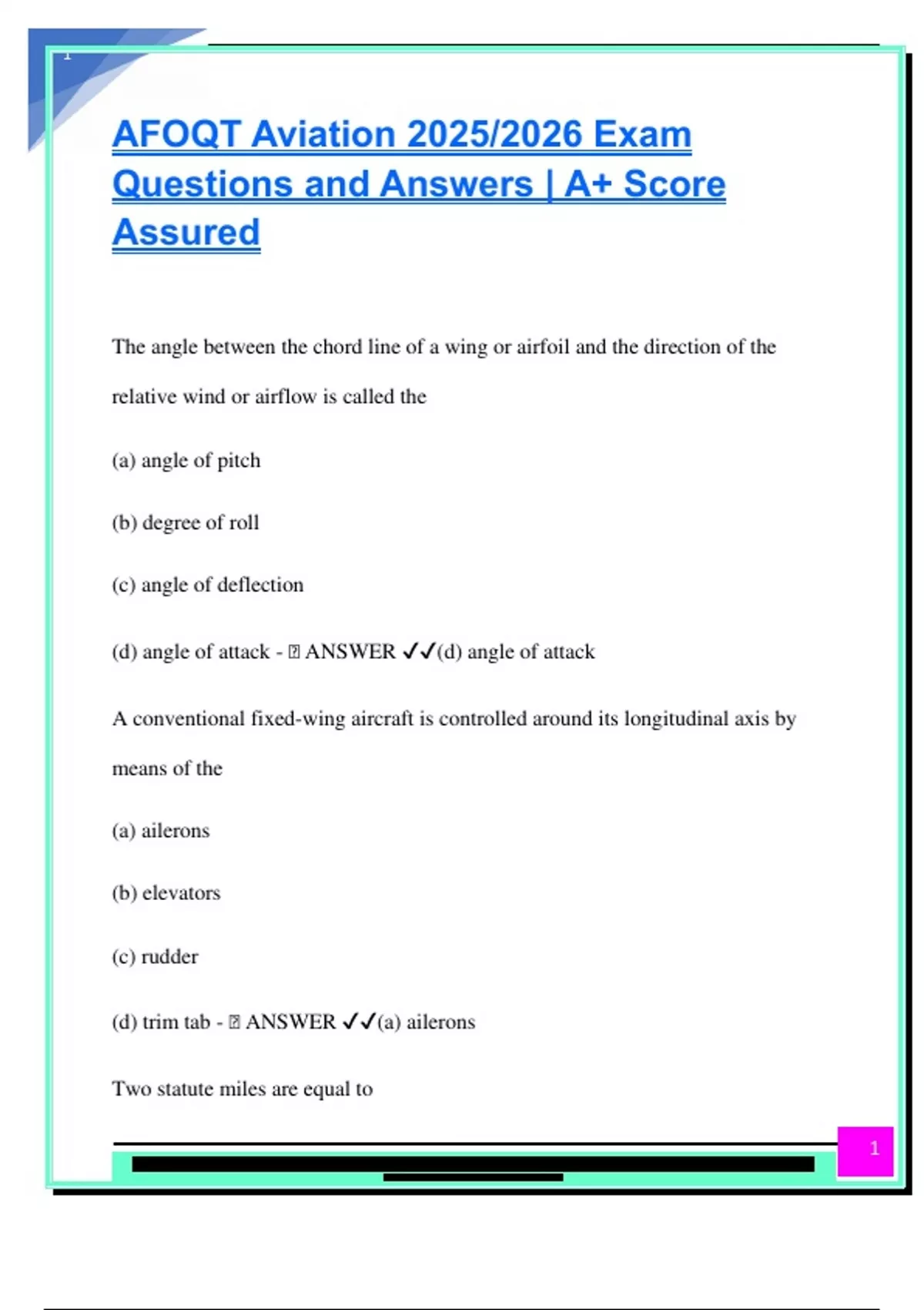 (d) angle of attack - 🧠 ANSWER ✔✔(d) angle of attack