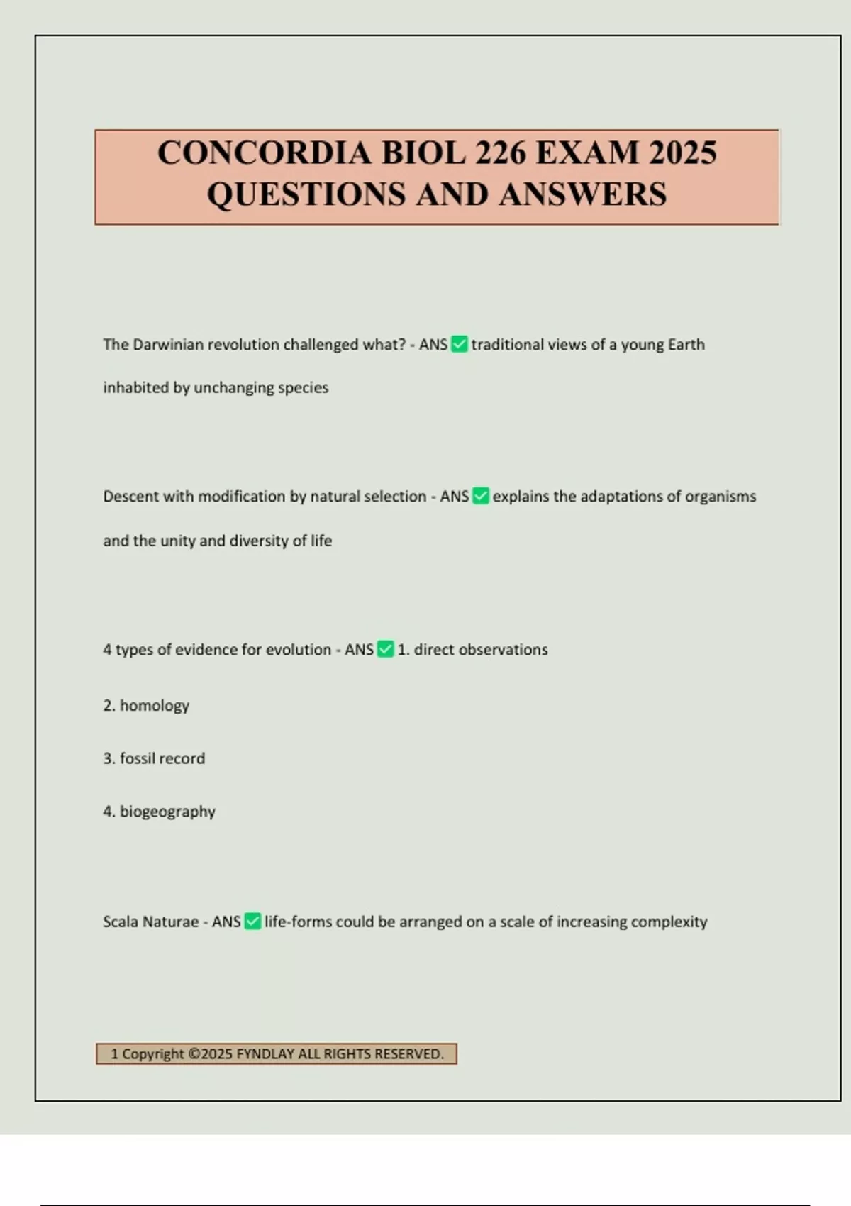 The Darwinian revolution challenged what? - ANS traditional views of a young Earth inhabited by unchanging species Descent with modification by natural selection - ANS explains the adaptations of organisms and the unity and diversity of life 4 types of evidence for evolution - ANS 1. direct observations 2. homology 3. fossil record 4. biogeography Scala Naturae - ANS life-forms could be arranged on a scale of increasing complexity CONCORDIA BIOL 226 EXAM 2025 QUESTIONS AND ANSWERS 2 Copyright ©2025 FYNDLAY ALL RIGHTS RESERVED. Evolution - ANS a change in the genetic composition of a population over time Lamarck's two mechanisms - ANS 1. use and disuse 2. inheritance of acquired characteristics Adaptations - ANS inherited characteristics of organisms that enhance their survival and reproduction in specific environments Malthus influence on Darwin - ANS most species produce large numbers of offspring Evidence that supports Darwin's Ideas - ANS 1. members of a population often vary in their inherited traits 2. all species produce more offspring than can survive 3. individuals with inherited characteristics that give them a higher fitness more likely to leave offspring than other individuals 4. this unequal a