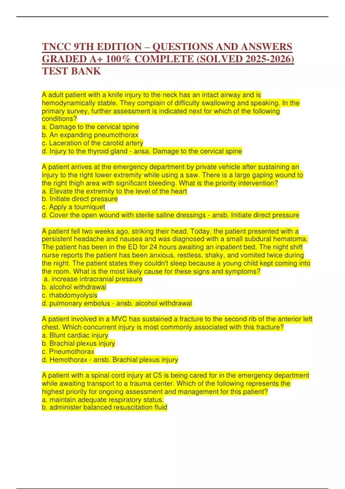 ,TNCC 9TH EDITION – QUESTIONS AND ANSWERS