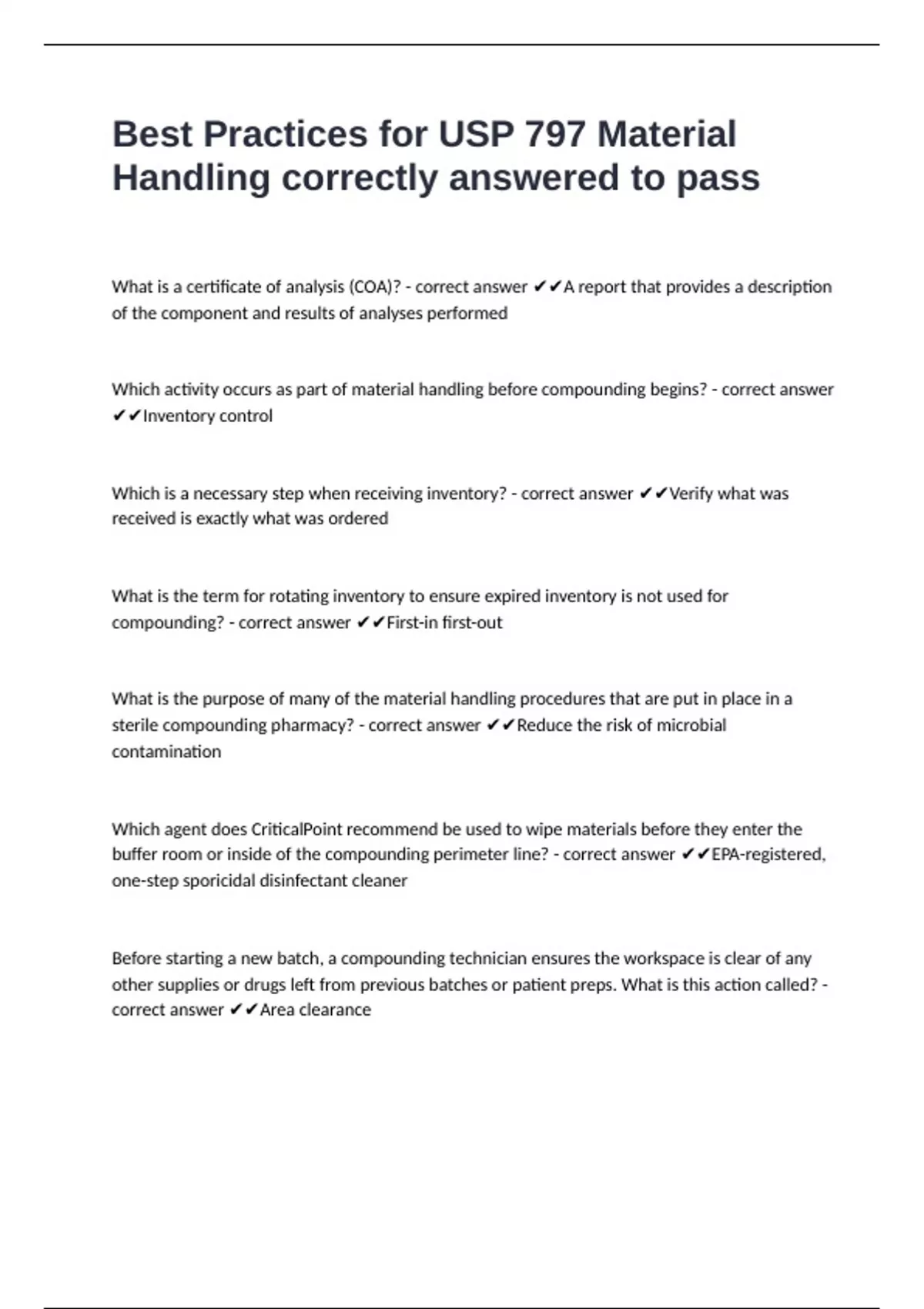 Best Practices for USP 797 Material Handling correctly answered to pass
