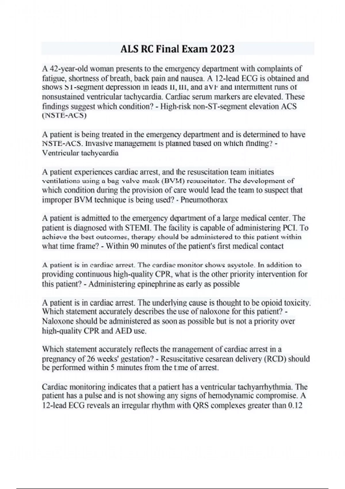 A 42-year-old woman presents to the emergency department with complaints of fatigue, shortness of breath, back pain and nausea. A 12-lead ECG is obtained and shows ST-segment depression in leads II, III, and aVF and intermittent runs of nonsustained ventricular tachycardia. Cardiac serum markers are elevated. These findings suggest which condition? - High-risk non-ST-segment elevation ACS (NSTE-ACS) A patient is being treated in the emergency department and is determined to have NSTE-ACS. Invasive management is planned based on which finding? - Ventricular tachycardia A patient experiences cardiac arrest, and the resuscitation team initiates ventilations using a bag-valve-mask (BVM) resuscitator. The development of which condition during the provision of care would lead the team to suspect that improper BVM technique is being used? - Pneumothorax A patient is admitted to the emergency department of a large medical center. The patient is diagnosed with STEMI. The facility is capable of administering PCI. To achieve the best outcomes, therapy should be administered to this patient within what time frame? - Within 90 minutes of the patient's first medical contact A patient is in cardiac arrest. The cardiac monitor shows asystole. In addition to providing continuous high-quality CPR, what is the other priority intervention for this patient? - Administering epinephrine as early as possible A patient is in cardiac arrest. The underlying cause is thought to be
