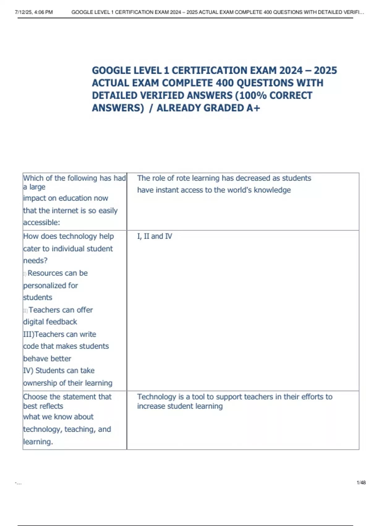 , 7/12/25, 4:06 PM GOOGLE LEVEL 1 CERTIFICATION EXAM 2024 – 2025 ACTUAL EXAM COMPLETE 400 QUESTIONS WITH DETAILED VERIFI…