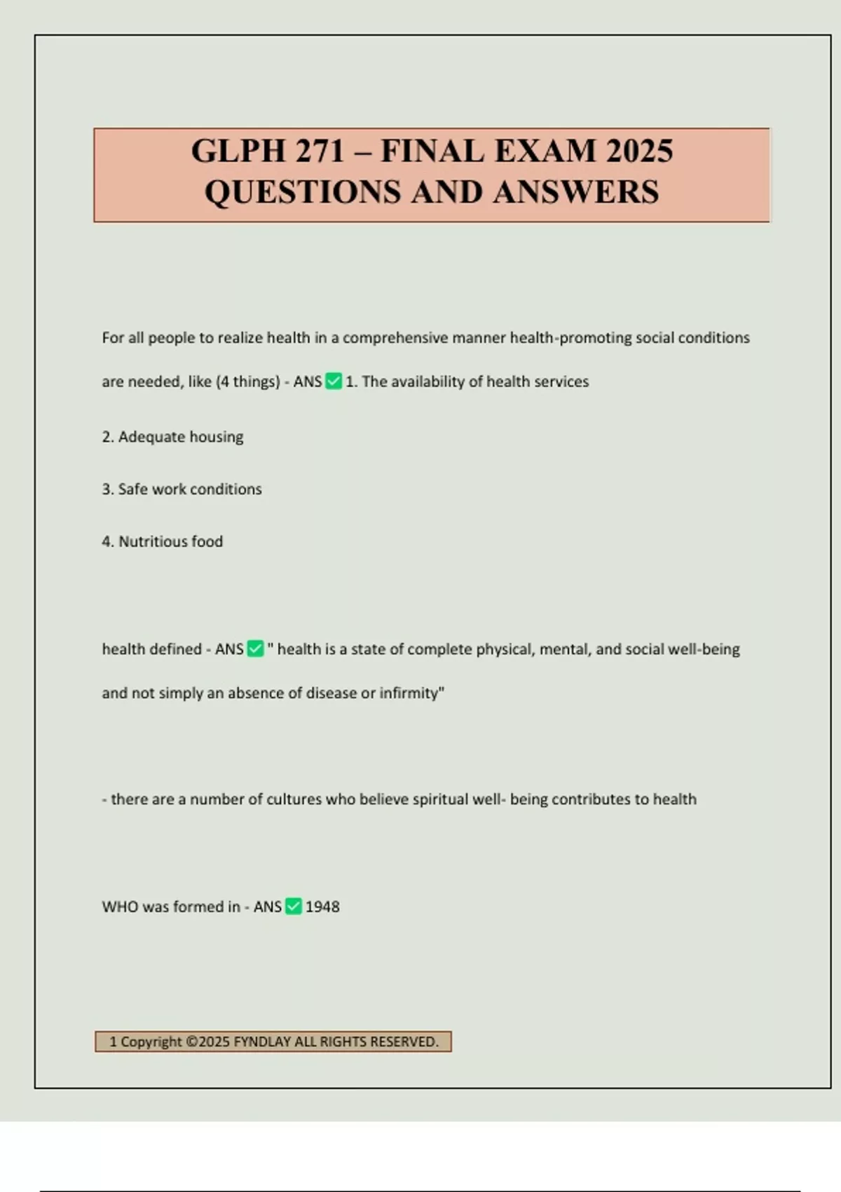 1 Copyright ©2025 FYNDLAY ALL RIGHTS RESERVED. For all people to realize health in a comprehensive manner health-promoting social conditions are needed, like (4 things) - ANS 1. The availability of health services 2. Adequate housing 3. Safe work conditions 4. Nutritious food health defined - ANS " health is a state of complete physical, mental, and social well-being and not simply an absence of disease or infirmity" - there are a number of cultures who believe spiritual well- being contributes to health WHO was formed in - ANS 1948 GLPH 271 – FINAL EXAM 2025 QUESTIONS AND ANSWERS 2 Copyright ©2025 FYNDLAY ALL RIGHTS RESERVED. world health day - ANS April 7th according to the constitution of the Who- health as a human right - ANS the enjoyment of the highest attainable standard of physical and mental health is one of the fundamental rights of every human being without distinction of race, religion, political benefit, economic or social condition" · In support of this mandate, WHO acts as the directing and coordinating authority for health within the UN system by: - ANS - Providing leadership on global health matters - Shaping the health research agenda - Setting norms and standards - Articulating evidence-based policy options - Providing technical support to countries - Monitoring and assessing health trends the health promotion movement of 1980 was fostered by the Who. This movement brought in a new understanding of health because it included the dynamic concept of_____ - ANS Resiliency: the extent to which an individual or group is able to realize aspirations and satisfy needs, and to change or cope with the environment. Health is a resource of everyday 3 Copyright ©2025 FYNDLAY ALL RIGHTS RESERVED. life, not the objective of living, it is a positive concept, emphasizing social and personal resources as well as physical capacities ___ + ____ + _____ = resiliency - ANS social support + emotional and mental capabilities + physical strength = resiliency Global health as a discipline was established on the basis of four factors - ANS 1. Decision making based on data and evidence - vital statistics, surveillance and outbreak investigations, laboratory science 2. A focus on populations rather than individuals 3. A goal of social justice and equity 4. An emphasis on prevention rather than curative care What is global health - ANS an area of study, research and practice that places a priority on improving health and achieving equity in health for all people worldwide. Global health emphasizes transnational health issues, determinants, and solutions, involves many disciplines within and beyond the health sciences and promoted interdisciplinary collaboration, and is a synthesis of pop