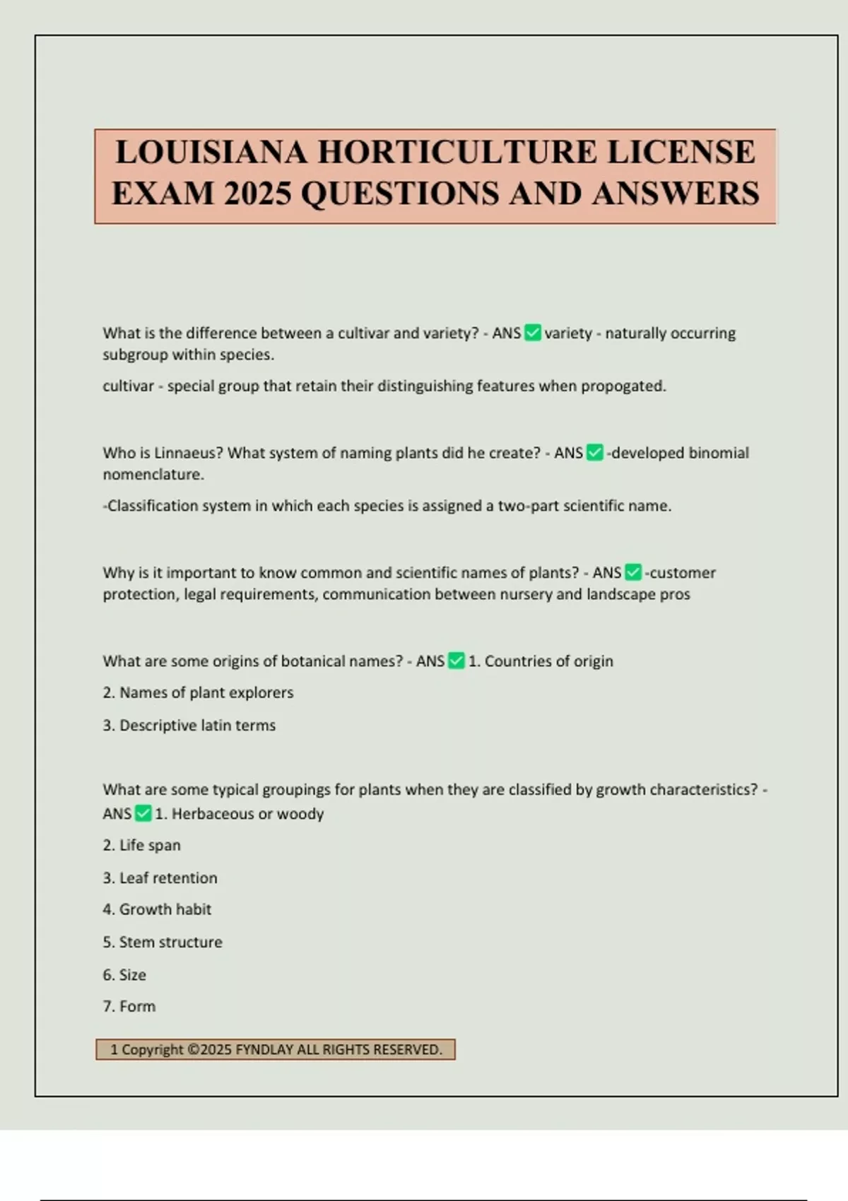What is the difference between a cultivar and variety? - ANS variety - naturally occurring subgroup within species. cultivar - special group that retain their distinguishing features when propogated. Who is Linnaeus? What system of naming plants did he create? - ANS -developed binomial nomenclature. -Classification system in which each species is assigned a two-part scientific name. Why is it important to know common and scientific names of plants? - ANS -customer protection, legal requirements, communication between nursery and landscape pros What are some origins of botanical names? - ANS 1. Countries of origin 2. Names of plant explorers 3. Descriptive latin terms What are some typical groupings for plants when they are classified by growth characteristics? - ANS 1. Herbaceous or woody 2. Life span 3. Leaf retention 4. Growth habit 5. Stem structure 6. Size 7. Form LOUISIANA HORTICULTURE LICENSE EXAM 2025 QUESTIONS AND ANSWERS 2 Copyright ©2025 FYNDLAY ALL RIGHTS RESERVED. 8. Temp tender 9. Light 10. Water 11. Use List the functions of a root system - ANS anchorage, absorption, conduction, storage What are 2 kinds of root systems - ANS Taproots and fibrous roots List the functions of the stem of the plant - ANS support, conduction, storage Define xylem and phloem - ANS xylem-water and minerals move from roots to leaves. phloem-food from leaves moves to the plant What is the difference between monocots and dicots? - ANS Number of cotyledons mono- 1 dicots-2 What are nodes and internodes - ANS nodes- areas on stems where leaves emerge. internodes-space between nodes List the types of specialized stems and roots commonly found in plants - ANS bulbs, corms, rhizomes, tubers, tuberous roots What are the 2 main functions of leaves - ANS photosynthesis and transpiration Transpiration- evaporation of water from the leaves of a plant Define angiosperms and gymnosperms - ANS Angiosperms- plants that bloom and develop fruit which encloses the seed 3 Copyright ©2025 FYNDLAY ALL RIGHTS RESERVED. Gymnosperms- plants that have no true flowers or fruit, but make seeds in cones List the parts of a complete flower - ANS -Stamen(Anther & Filament) -Pistil(Stilma; Style; Ovary) -Petal -Sepal -Locule -Ovule -Placenta -Receptacle -Peduncle List the priority in which plant parts receive food manufactured by the leaves - ANS 1. Flower 2. Seeds 3. Leaves 4. Stems 5. Roots List the 3 primary elements for essential plant growth - ANS 1. carbon 2. hydrogen 3. oxygen List the three macronutrients essential for plant growth - ANS 1. nitrogen 2. phosphorus 3. potassium List the 7 micronu