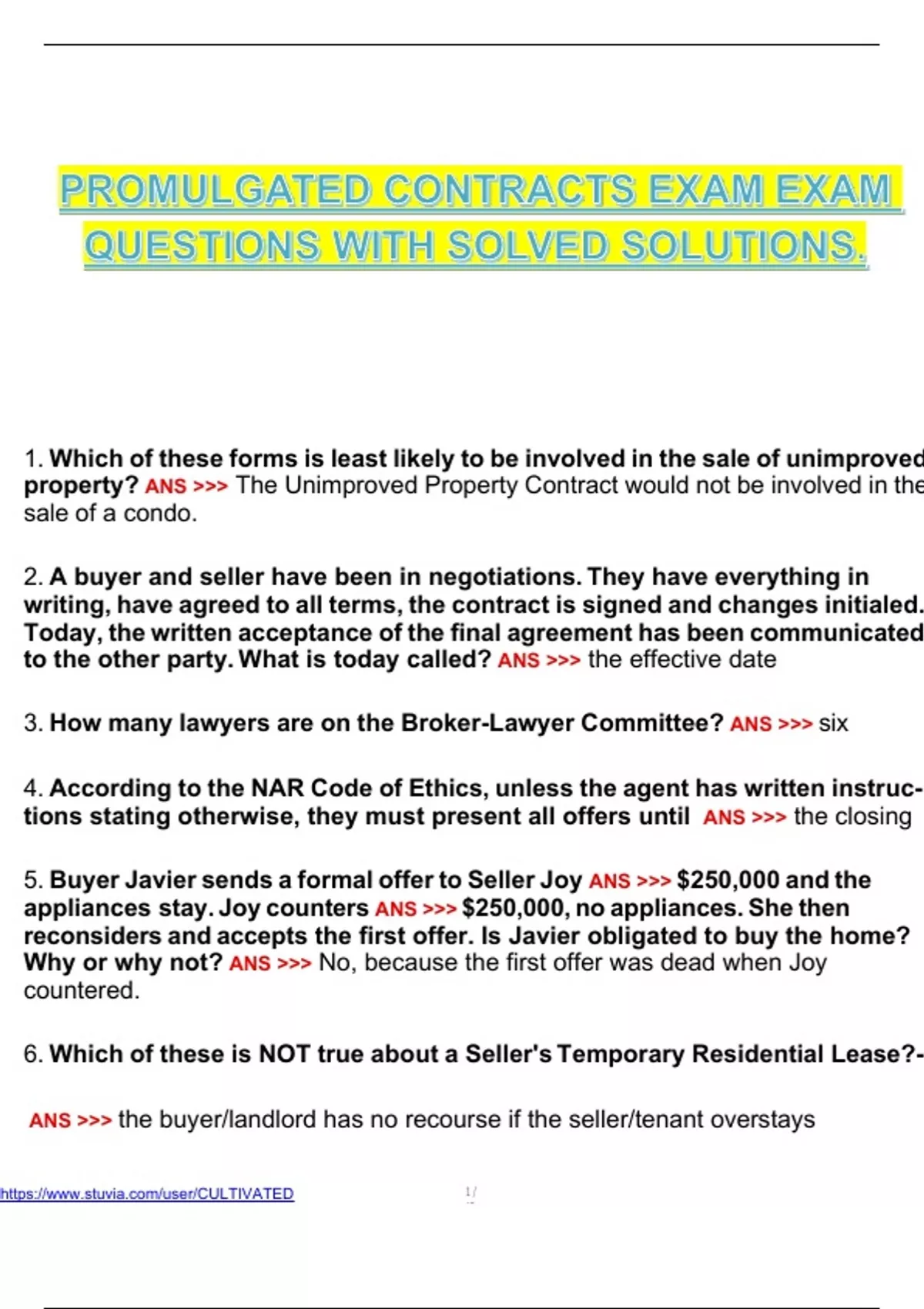 PROMULGATED CONTRACTS EXAM EXAM QUESTIONS WITH SOLVED SOLUTIONS.
