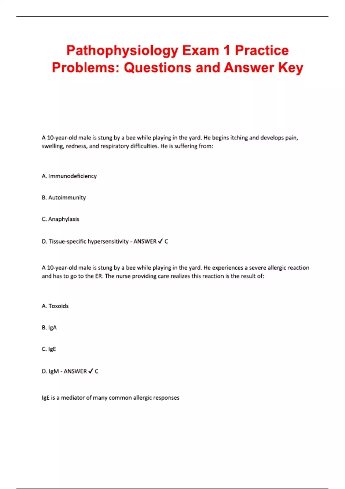 Pathophysiology Exam 1 Practice Problems Questions and Answer Key