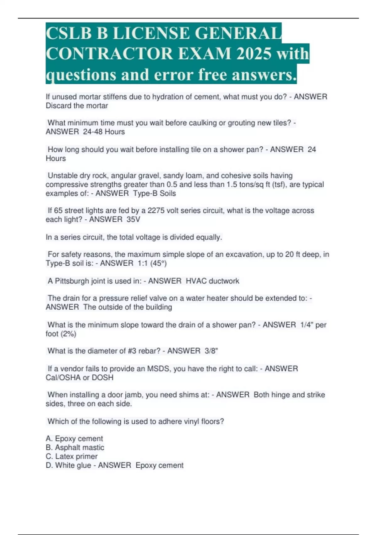 If unused mortar stiffens due to hydration of cement, what must you do? - ANSWER Discard the mortar What minimum time must you wait before caulking or grouting new tiles? - ANSWER 24-48 Hours How long should you wait before installing tile on a shower pan? - ANSWER 24 Hours Unstable dry rock, angular gravel, sandy loam, and cohesive soils having compressive strengths greater than 0.5 and less than 1.5 tons/sq ft (tsf), are typical examples of: - ANSWER Type-B Soils If 65 street lights are fed by a 2275 volt series circuit, what is the voltage across each light? - ANSWER 35V In a series circuit, the total voltage is divided equally. For safety reasons, the maximum simple slope of an excavation, up to 20 ft deep, in Type-B soil is: - ANSWER 1:1 (45°) A Pittsburgh joint is used in: - ANSWER HVAC ductwork The drain for a pressure relief valve on a water heater should be extended to: - ANSWER The outside of the building
